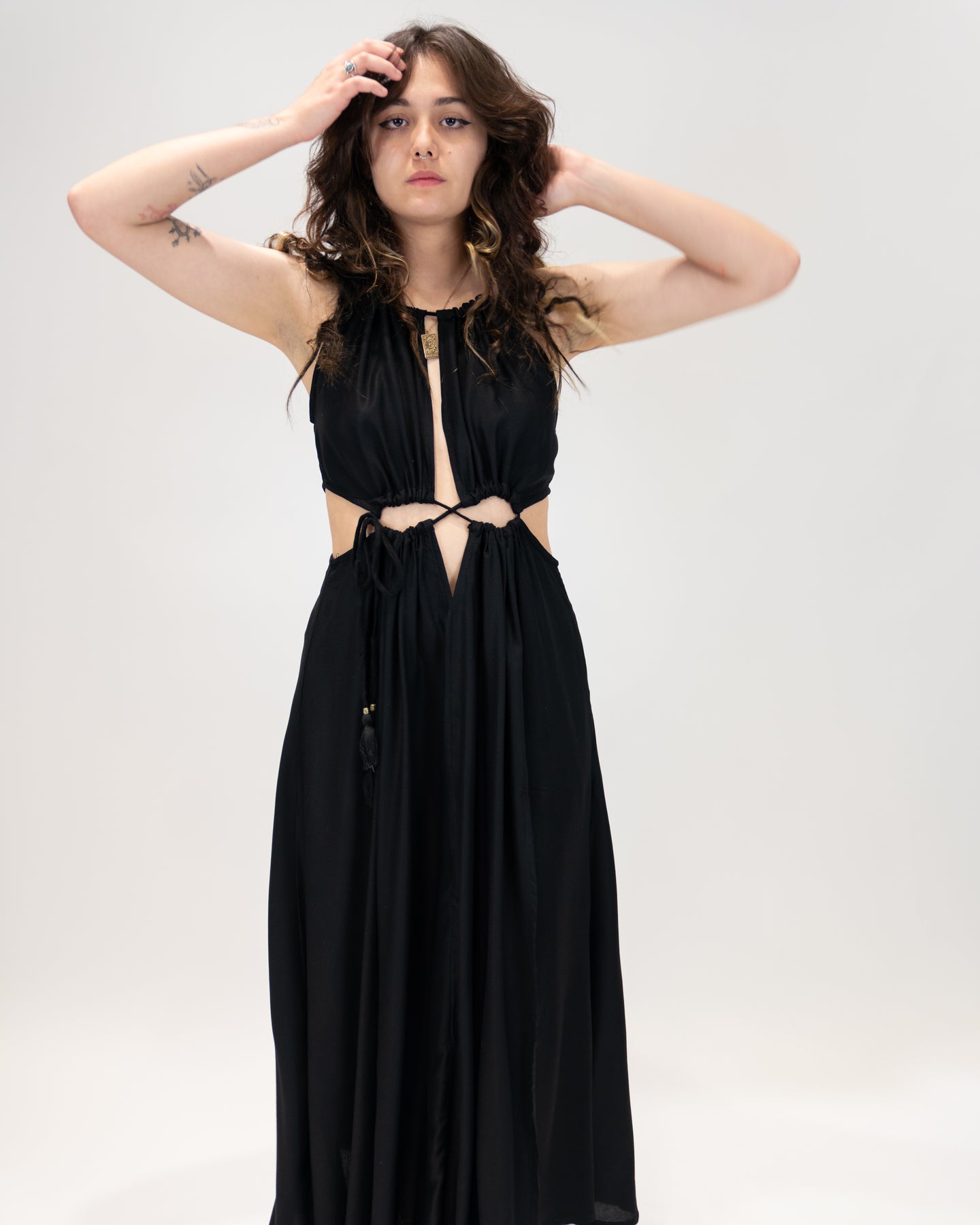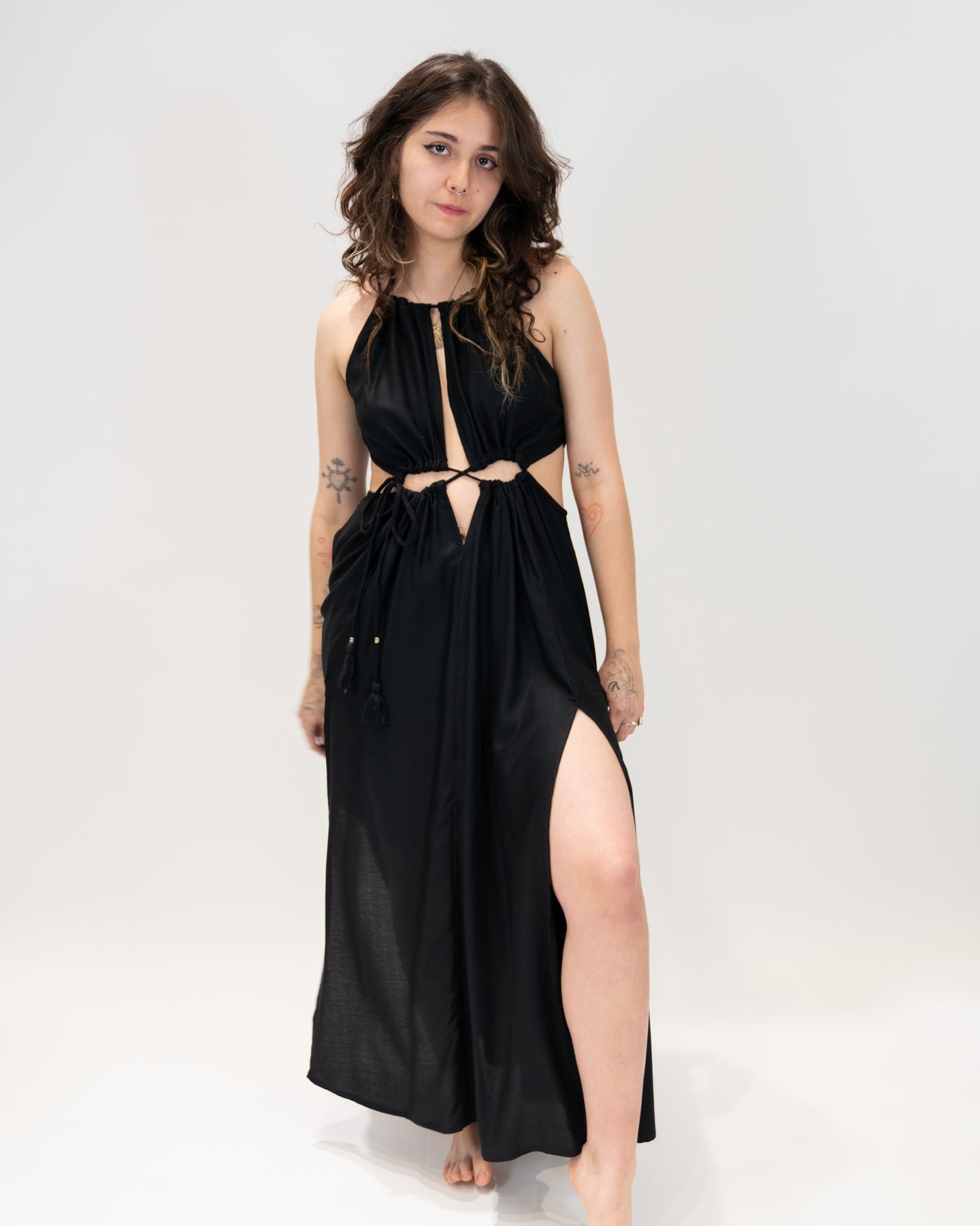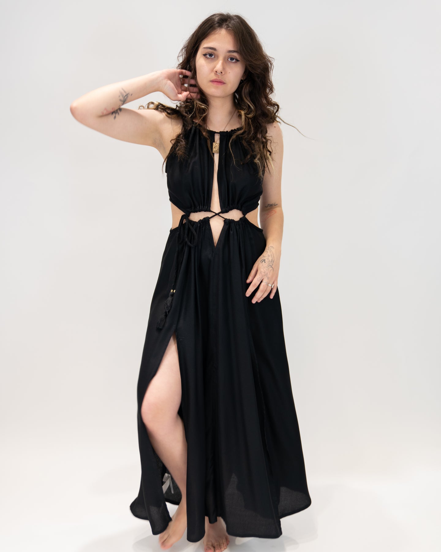 • שמלת קשירה שחורה עם קשירת אין סוף בבטן, תהיה שמלת החרישה שלך העונה!