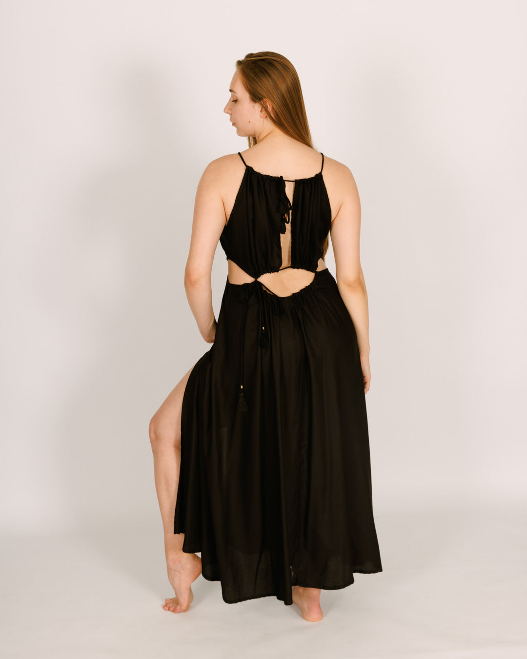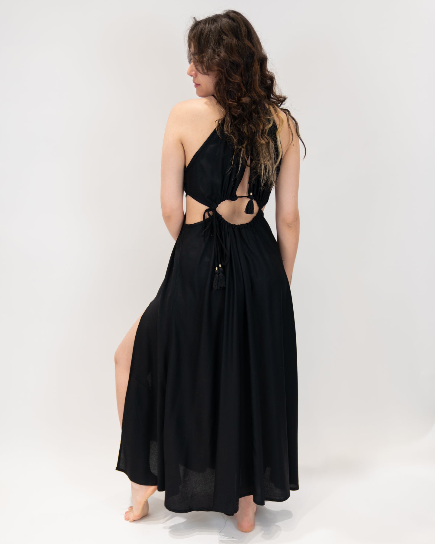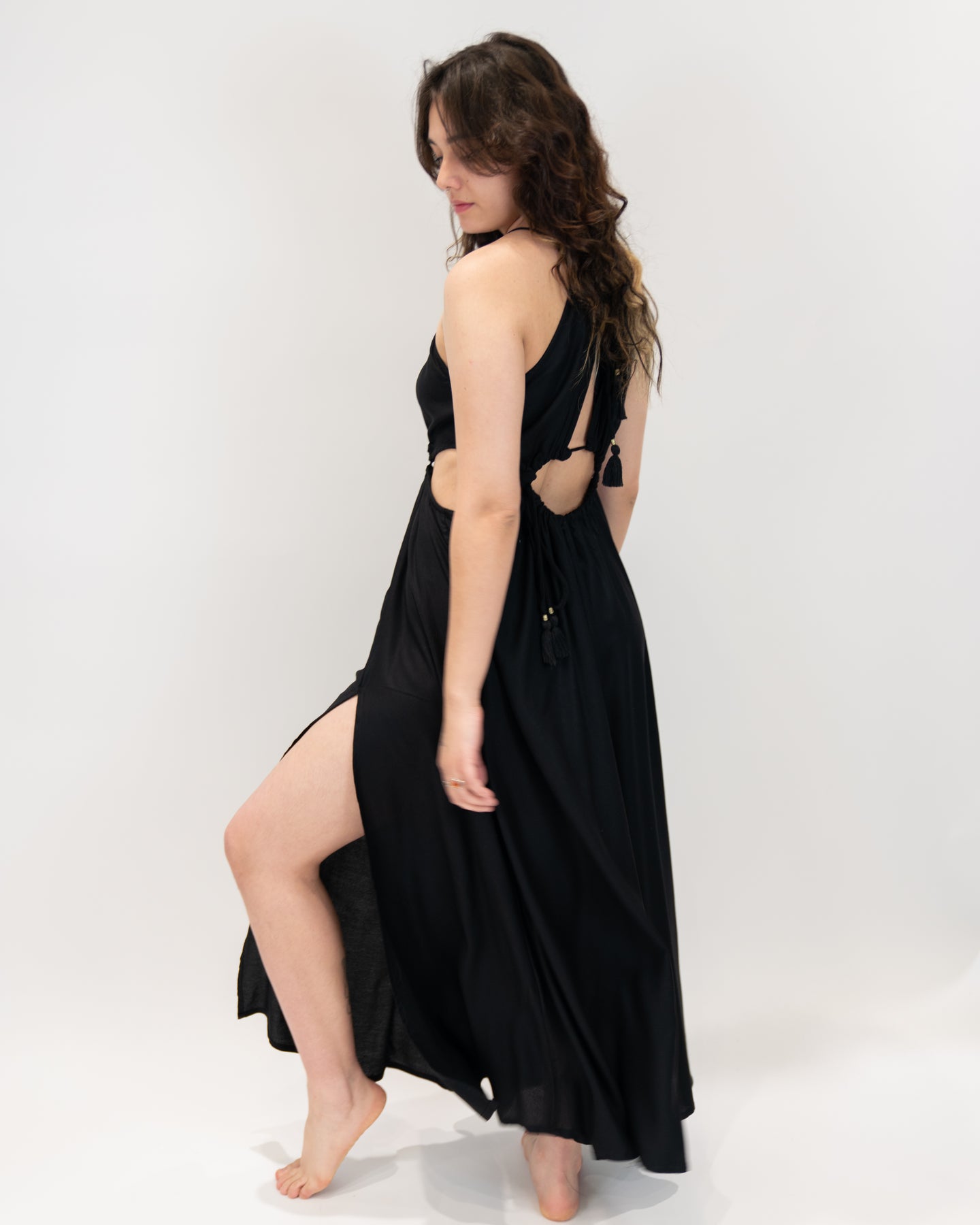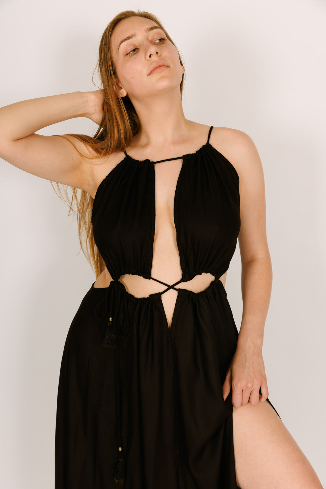 • שמלת קשירה שחורה עם קשירת אין סוף בבטן, תהיה שמלת החרישה שלך העונה!