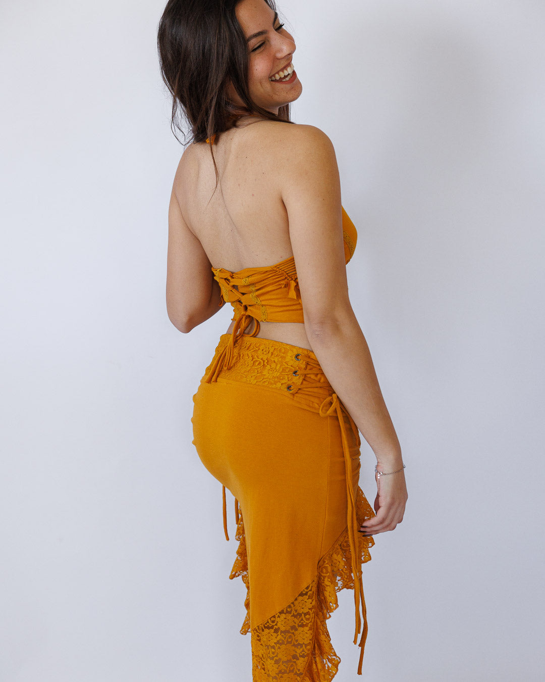 טופ סופר־מחמיא עם שזירות בד בקדימה, בצדדים ובגב. הלייקרה הגמישה נצמדת ברכות לגוף, מאפשרת טווח תנועה רחב ויוצרת מראה אוחז, מדויק ומרשים — מבייסיק יומיומי ועד ערב ומסיבות.