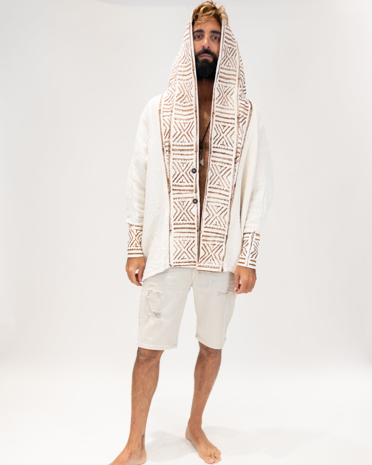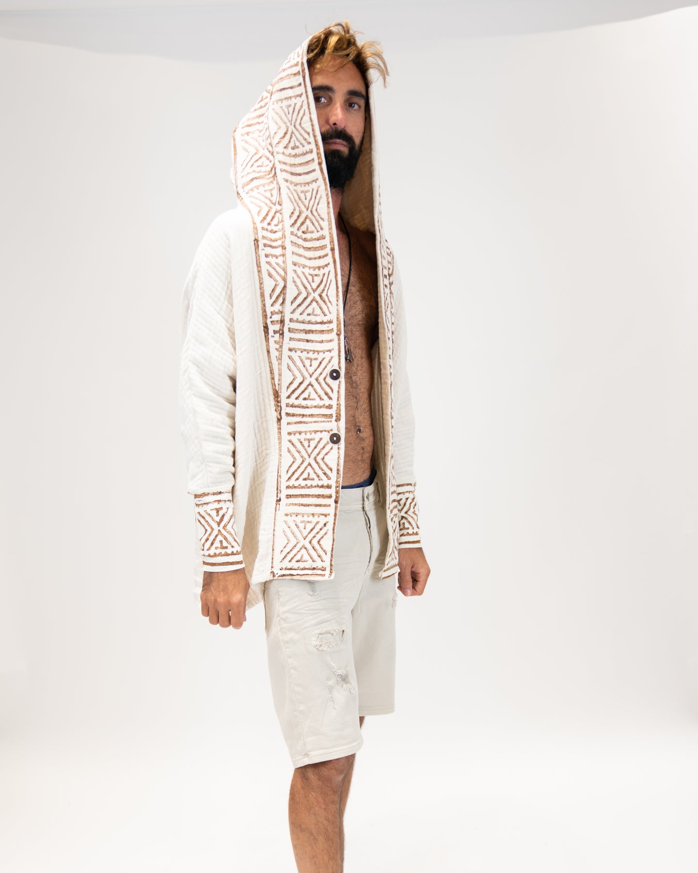 מעיל פיקה לבן עם חותמות וכובע לגבר
