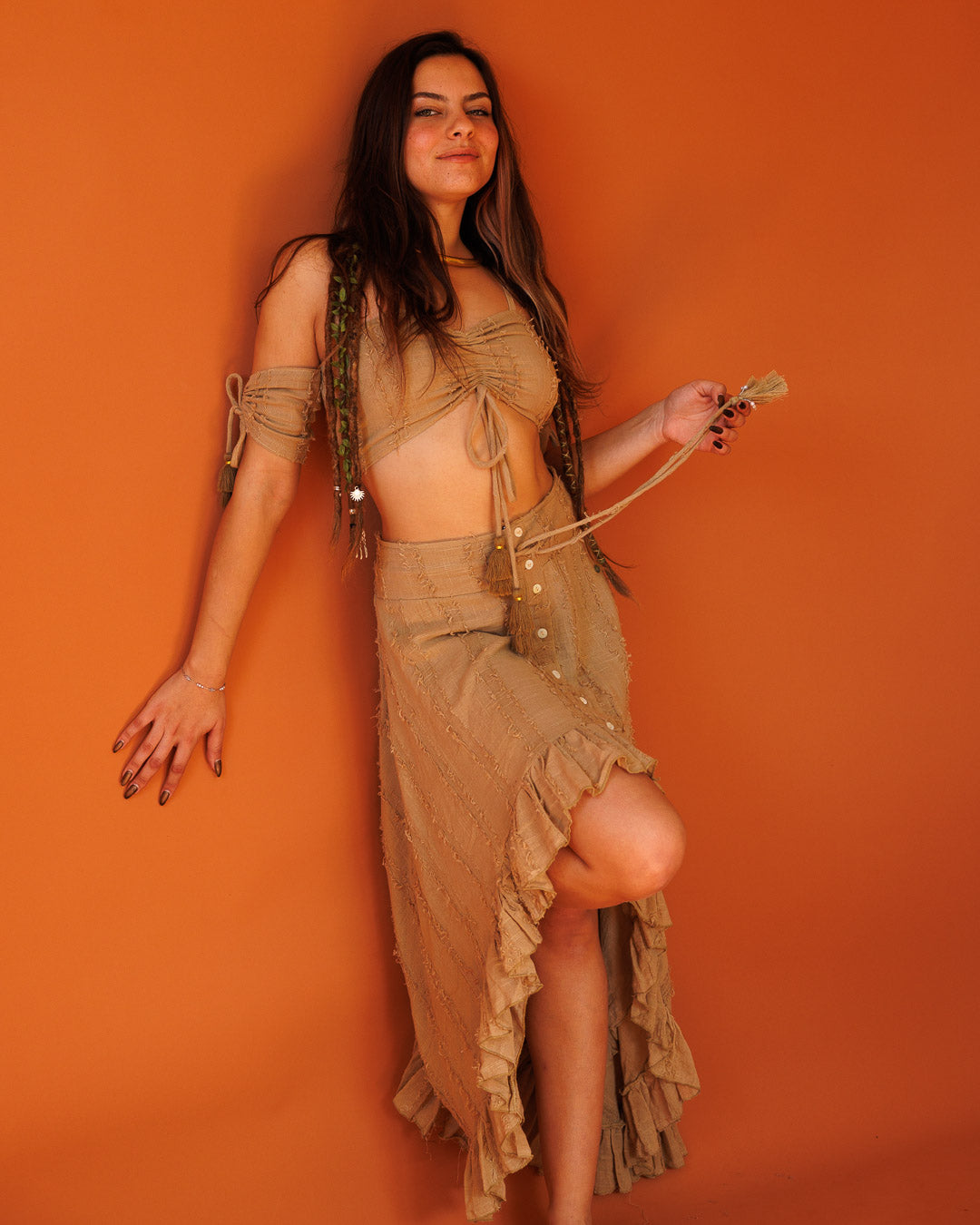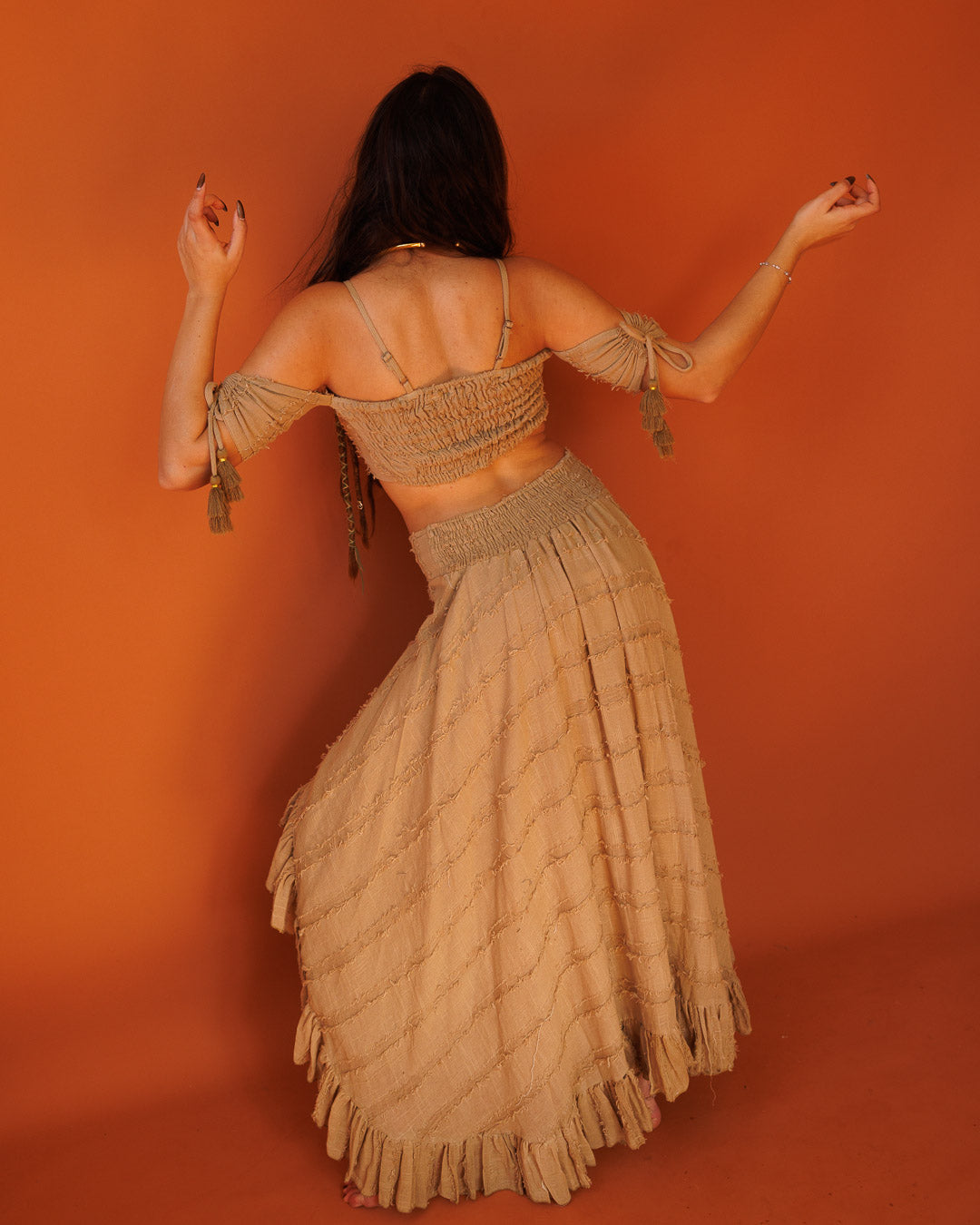 טופ קצר עם וייב בוהו־עדין שמרגיש כמו “קצפת” על הגוף — שילוב של כותנה חאקי עם טקסטורת פרנזים, כיווץ קדמי שמדגיש את החזה בצורה מחמיאה, ושרוולים קצרים, הניתנים לכיווץ מגניב, שיושבים יפה על הזרוע ומוסיפים אופי. מושלם לימים חמים, לפסטיבלים, וללוקים לבנים נקיים עם נוכחות.