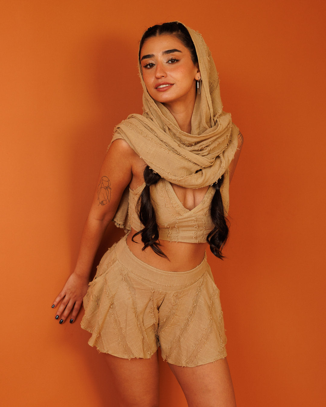 מכנס מטריה קצר בגוון חאקי חם, עם נפילה קלילה ותנועה “מרחפת” שמרגישה כמו חצאית־מיני אבל נוחה כמו שורטס. הבד מגיע עם טקסטורת פרנזים טבעית ועדינה שמוסיפה עומק, עניין ואופי בוהו־פרימיום בכל זווית.