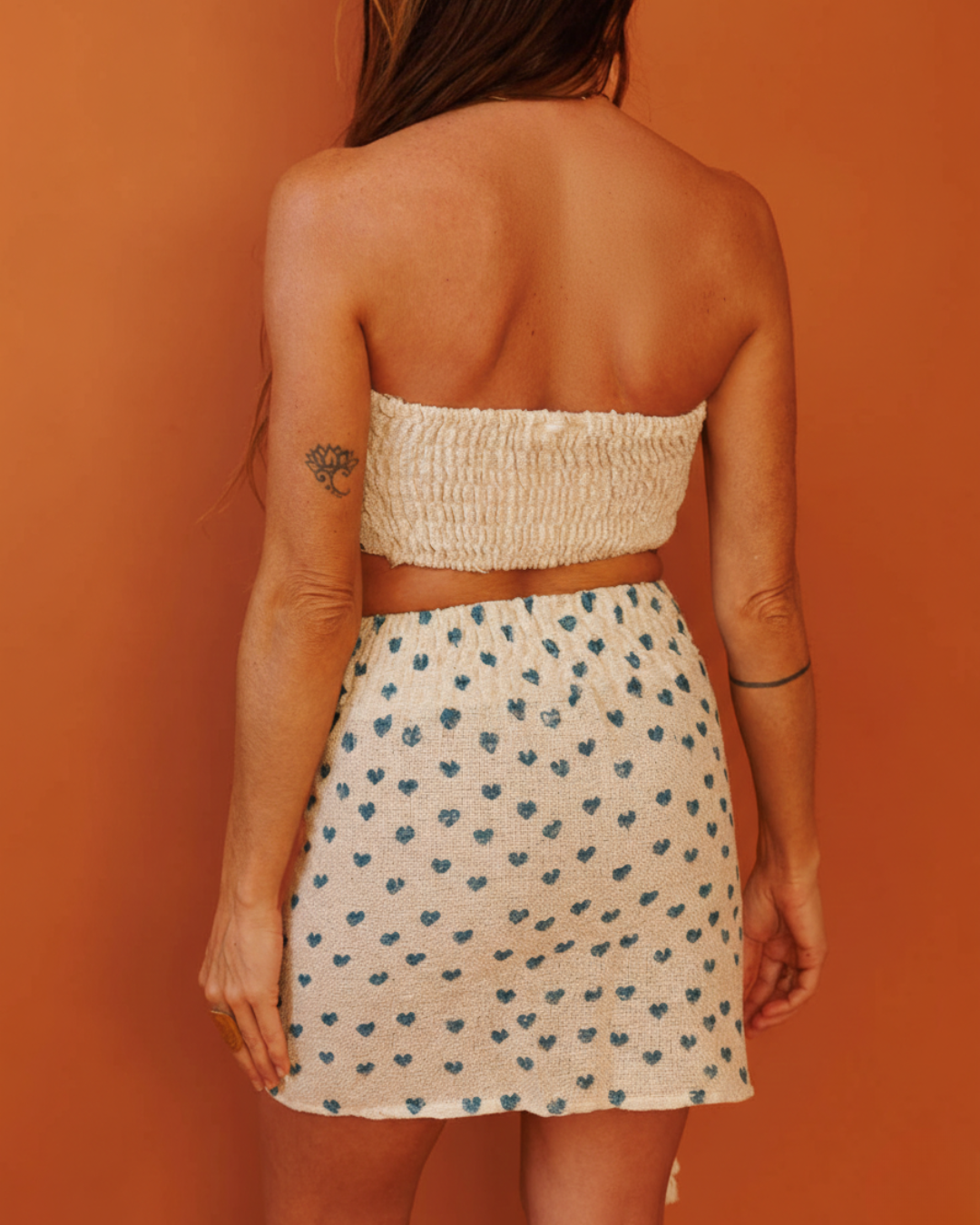 סט טופ סוכריה סטרפלס + חצאית כותנת במבולה נטורל בהדפס לבבות כחולים: