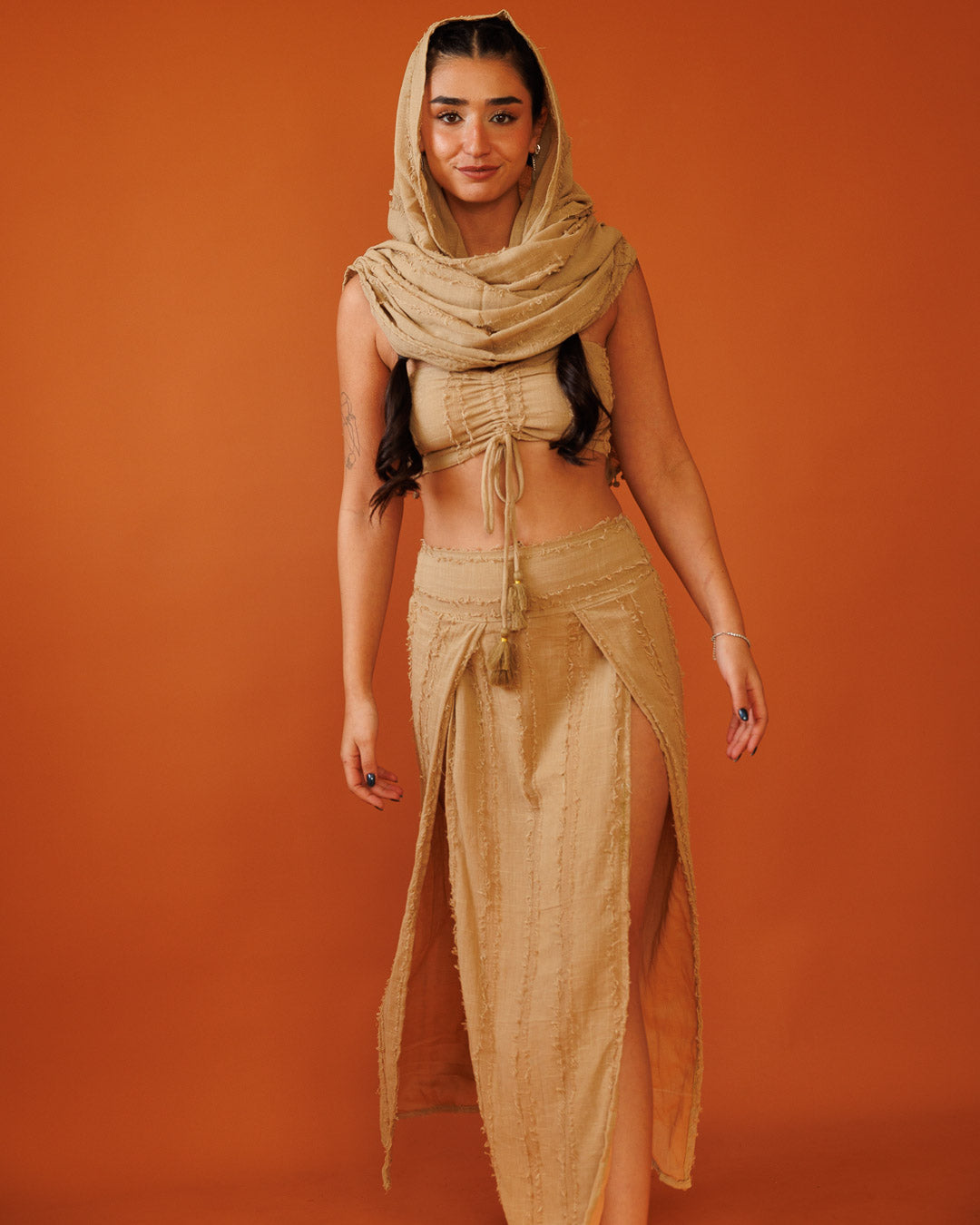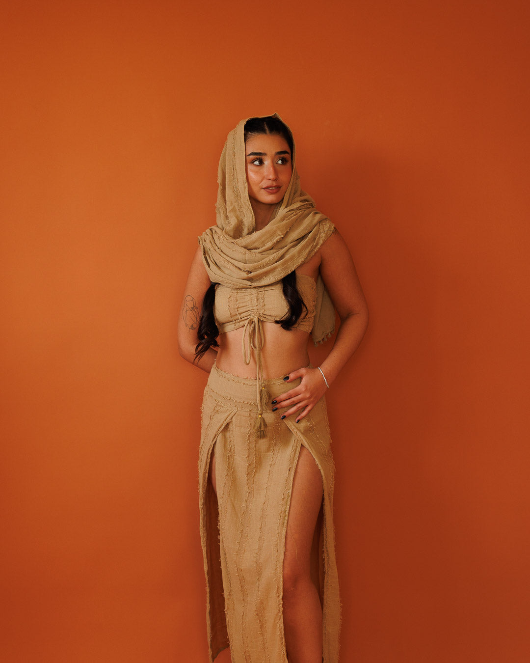 צעיף פרנזים טקסטורלי: פריט קטן שעושה קסם גדול. קליל, נשפך, ומוסיף שכבה של סטייל בוהו־מדברי לכל לוק. אפשר ללבוש אותו כצעיף, ככיסוי ראש כמו בתמונה, או כפראו / חצאית על בגד ים – ואת מסודרת.