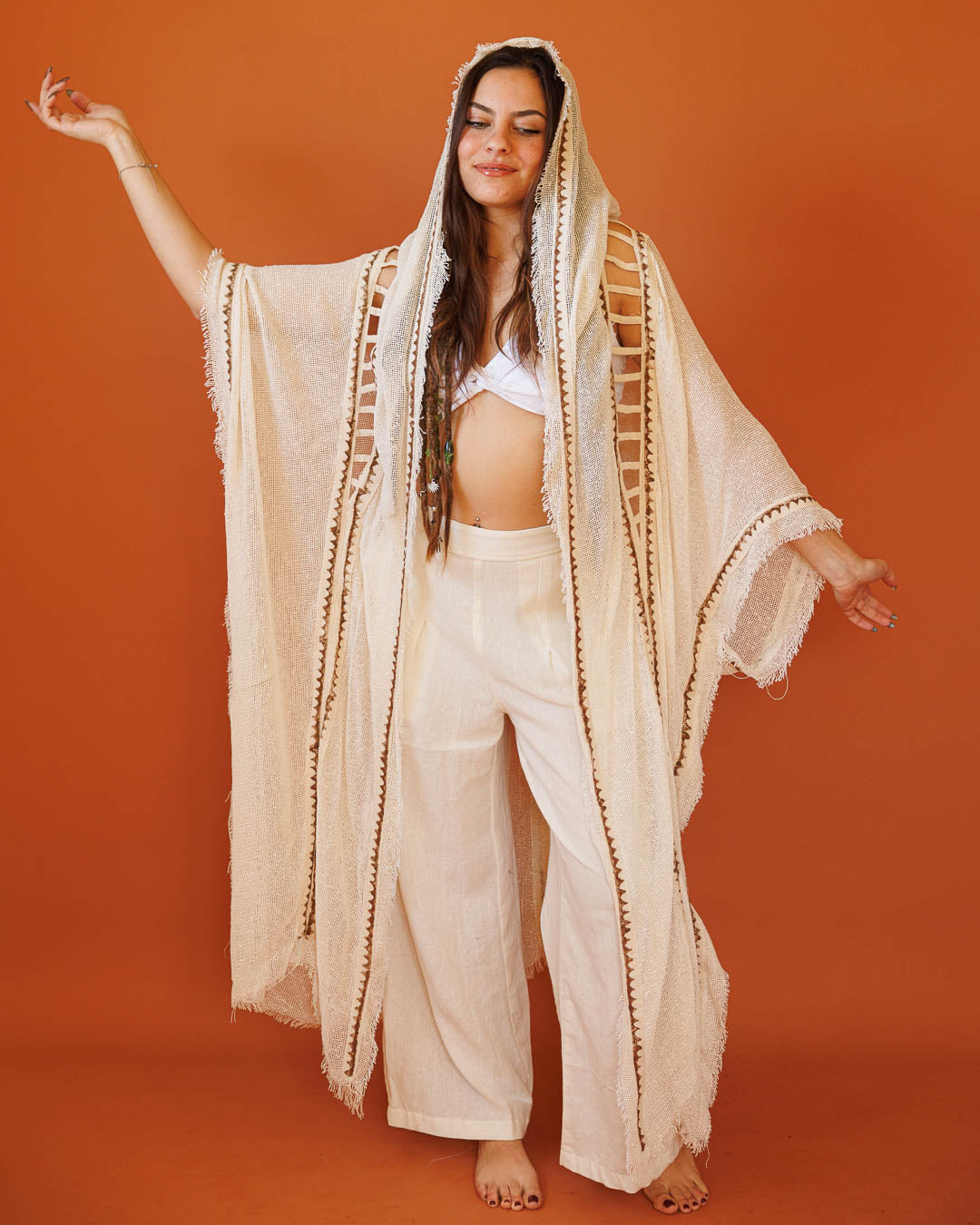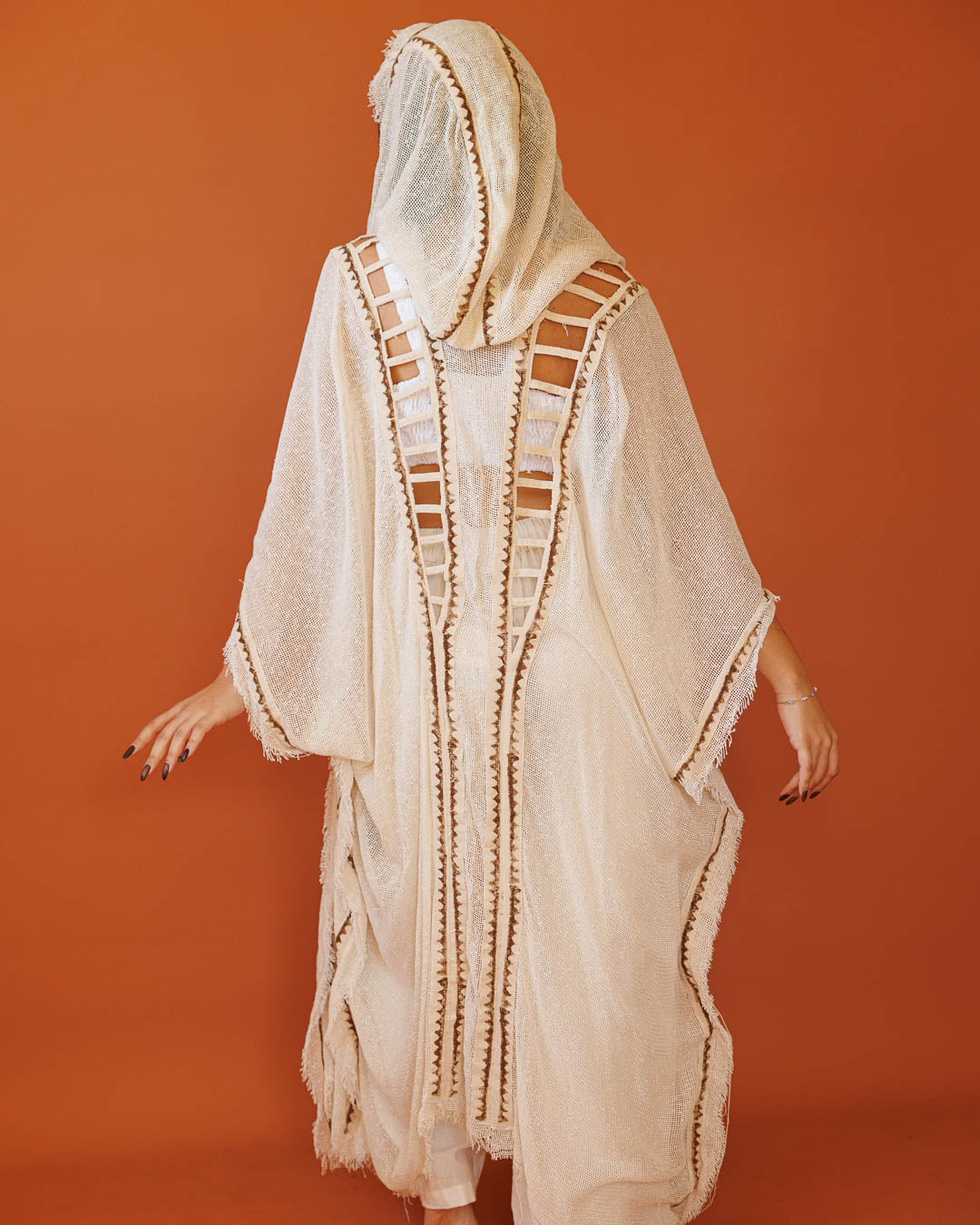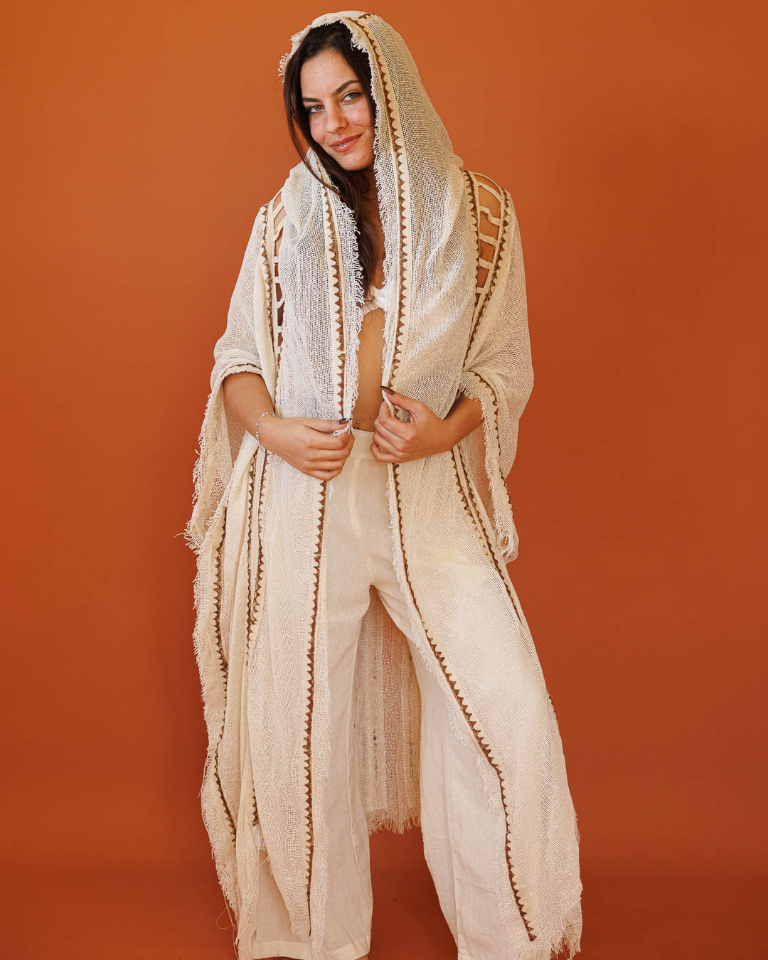 קימונו רשת נטורל עם קפוצ׳ון: שכבת סטייטמנט קלילה עם שקיפות עדינה — בד רשת אוורירי שנשפך על הגוף, עיטורי פס גאומטרי בגוון אפור שממסגרים את הקצוות, ודיטייל “לייסינג” בצד שמוסיף עומק וטקסטורה. נלבש פתוח ומייצר תנועה דרמטית בכל צעד.