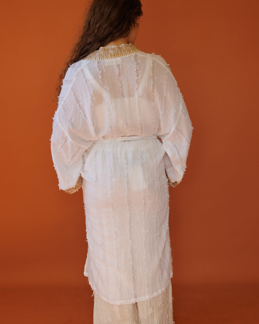 קימונו מקסי, כותנה לבנה פרנזים, שרוול ארוך, בעיטור קש לאישה