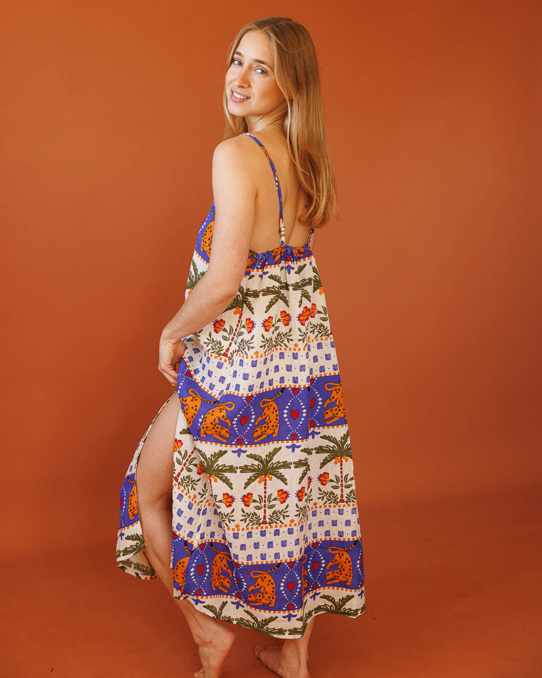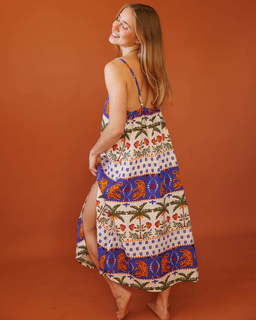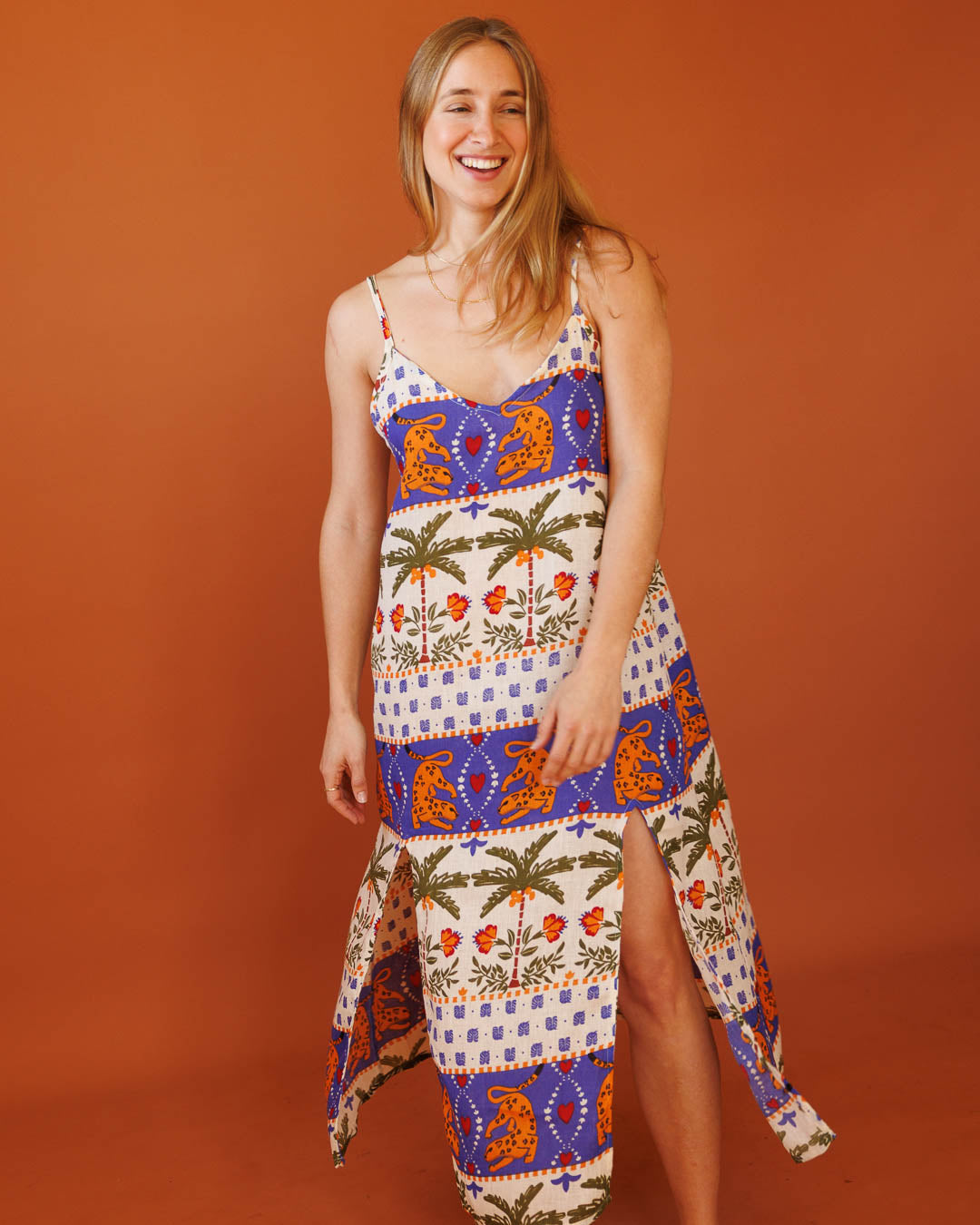 שמלת מקסי פשתן עם שסעים והדפס גאומטרי: שמלת כתפיות נשית עם נפילה רכה ותנועה חופשית. שסעים גבוהים שמאריכים את הרגל ונותנים דרמה מדויקת, ואבזם התאמה בחזייה שמאפשר לדייק את הישיבה באזור החזה. יש גומי מאחור להתאמה למגוון מידות.