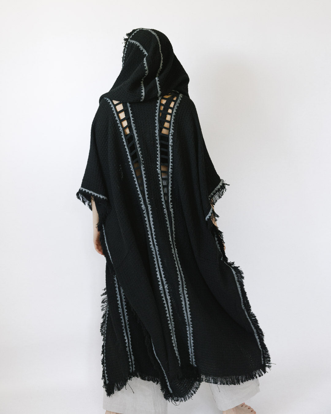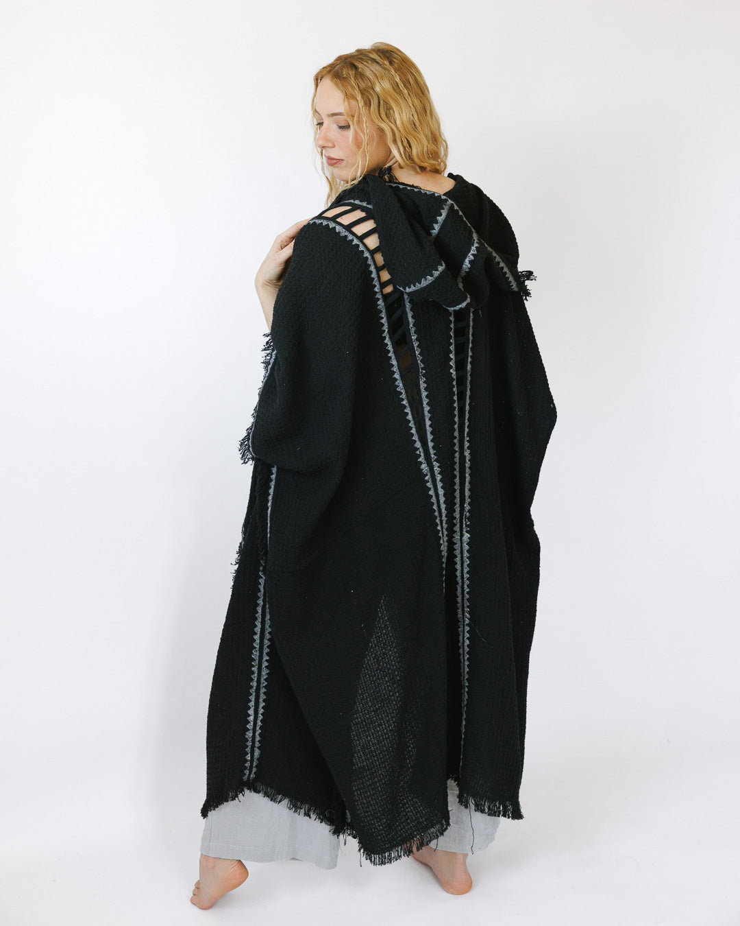 קימונו מקסי שחור עשוי כותנת פיקה איכותית, עם הדפס בלוק־פרינט ידני בעבודת חותמות עץ בגוון אפור. פריט נשי עם נוכחות עמוקה — שילוב מדויק של בוהו, אדג׳יות ואלגנטיות מחוספסת. הגזרה פתוחה וזורמת, עם תנועה דרמטית ונפילה חופשית שמלטפת את הגוף ומרגישה טבעית עליו.