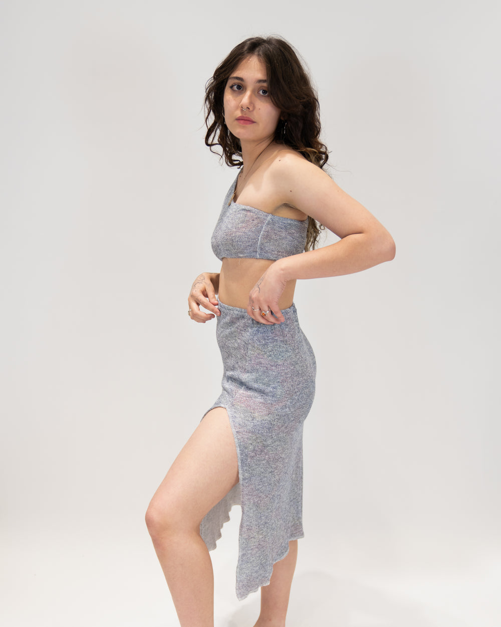 שמלה כתף אחת, כותנה לייקרה כחול אדום מנצנץ, שקופה, שסע צידי