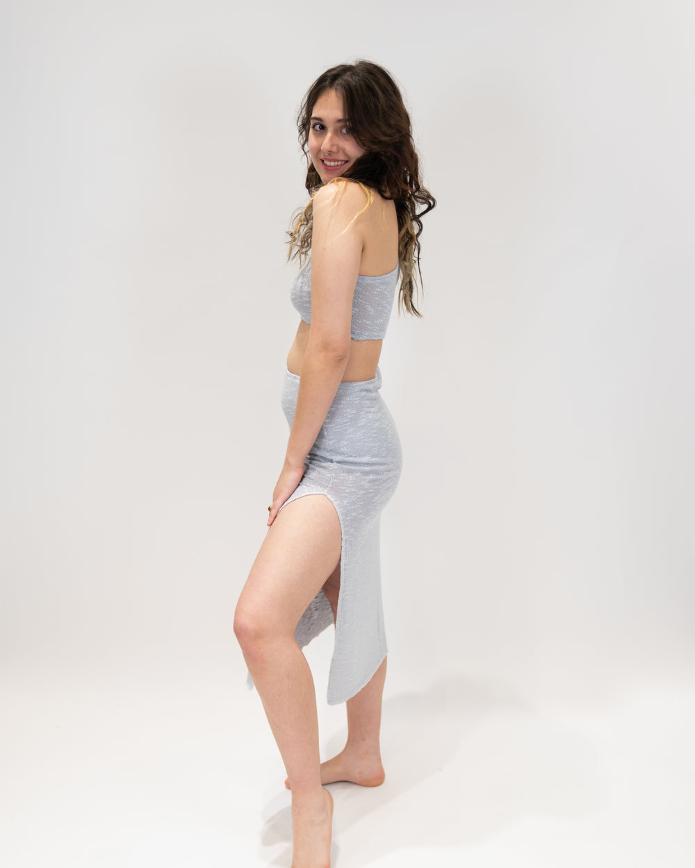 שמלה כתף אחת, כותנה לייקרה תכלת/ אפור בהיר, שקופה, שסע צידי