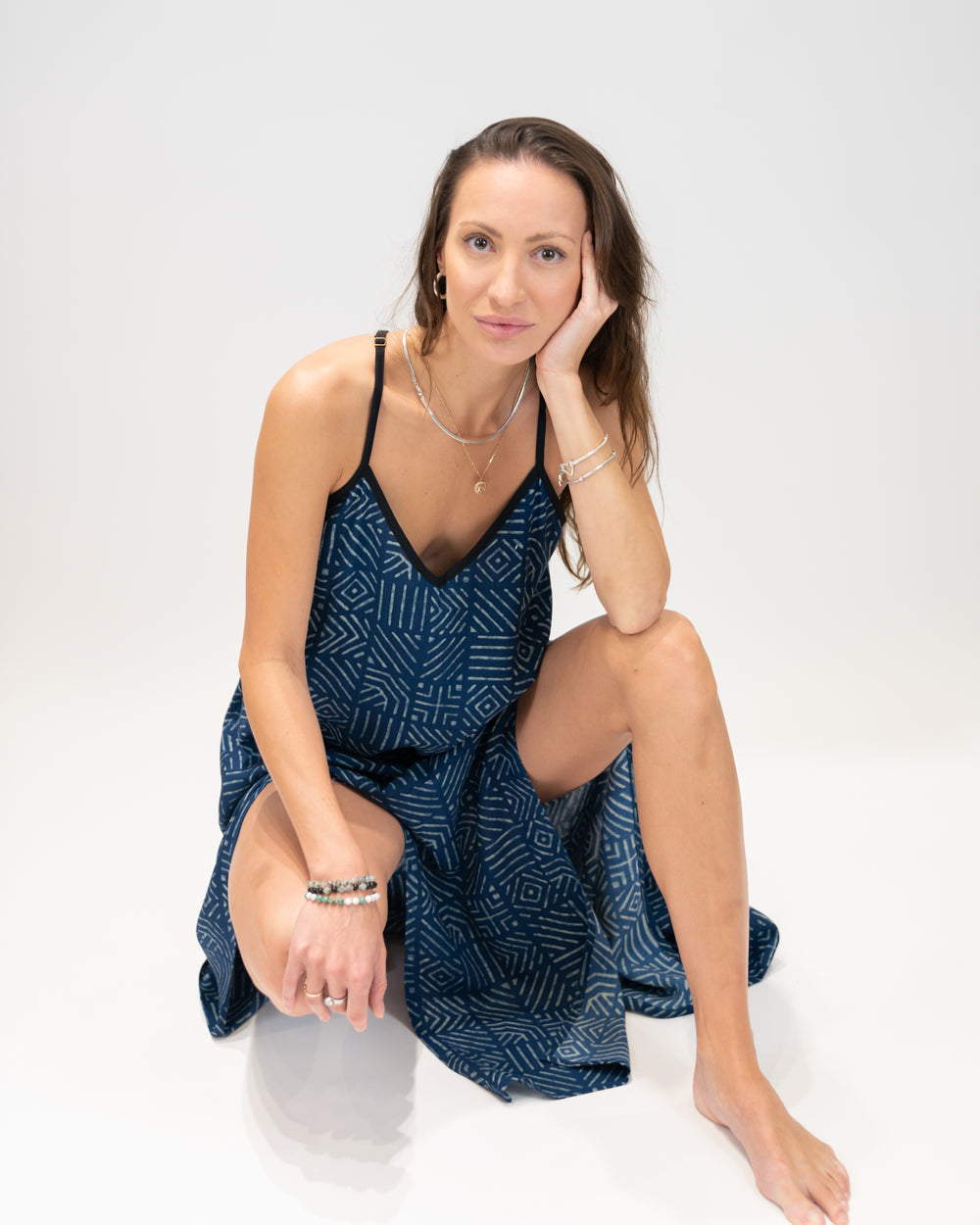 שמלה מקסי כותנה כחולה, שסעים, בהדפס שבטי לבן