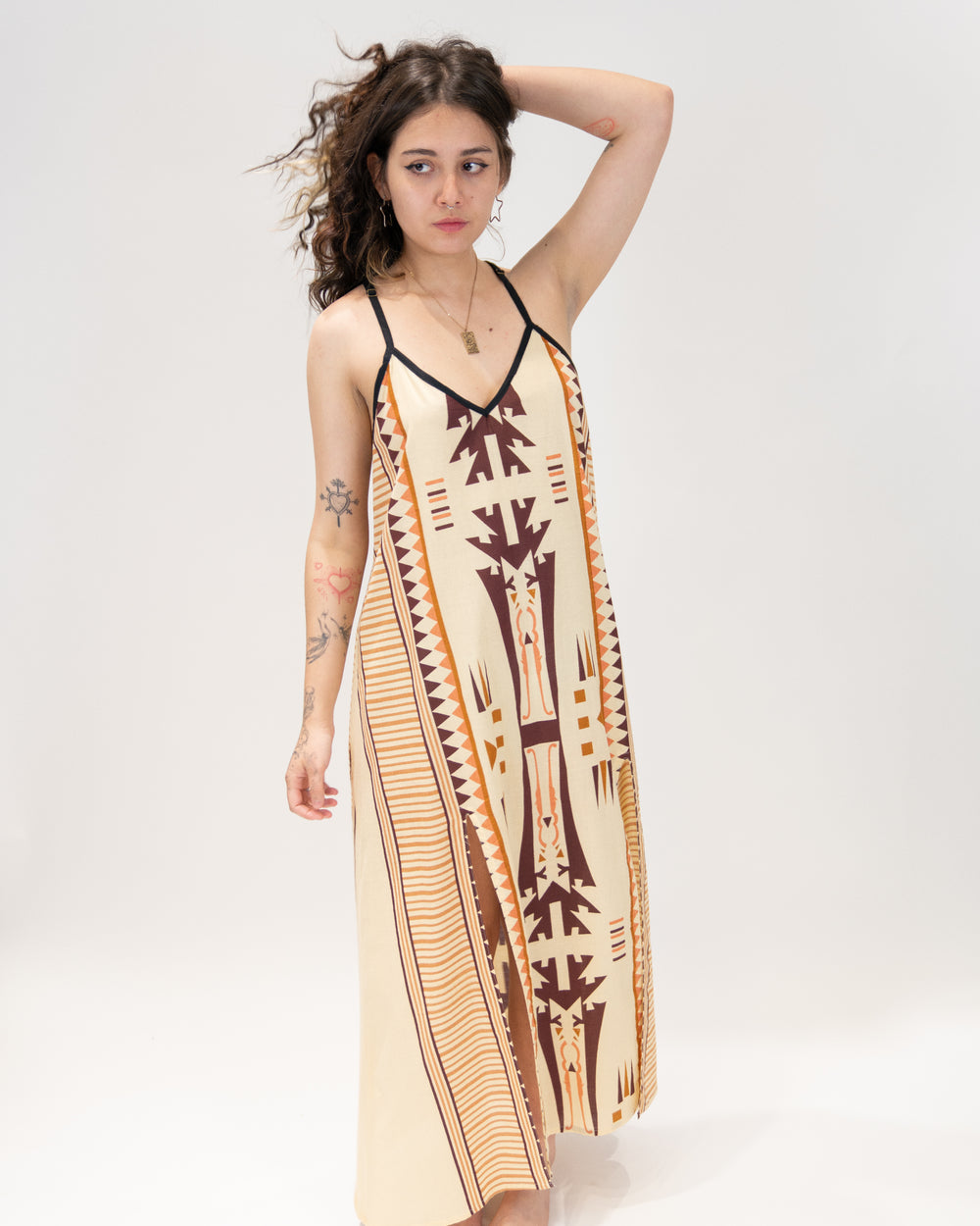 • שמלת מקסי קלילה ומגניבה עם 2 שסעים עמוקים וסקסים, עשויה כותנה בהדפס שבטי לבן, ומגניב במיוחד, מבטיחה לך מראה מלא סטייל וקלאסיות לכל מאורע: תוכלי ללבוש אותו עם האקססוריז הנכון החל מחוף הים, בית קפה עם חברה ועד חתונה.