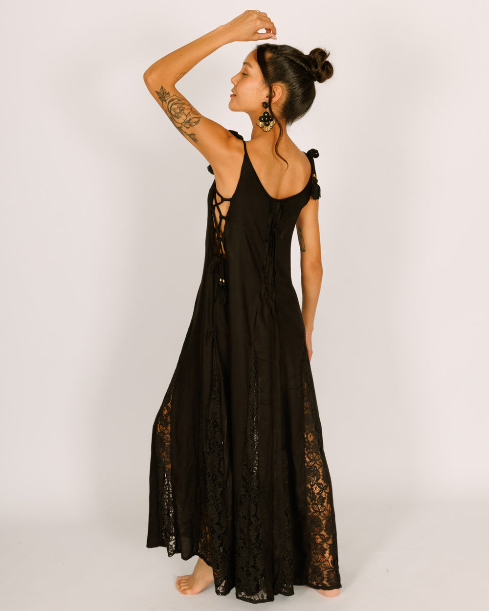 • שמלת מקסי שחורה עם פס ויסקוז ופס רשת פרחוני, הוא בדיוק השילוב בין סטייל לקלאסיות. עם האקססוריז הנכון תוכלי ללבוש אותה לבית קפה עם חברה, ארוחת שישי, בר, מסיבה ועד חתונה.