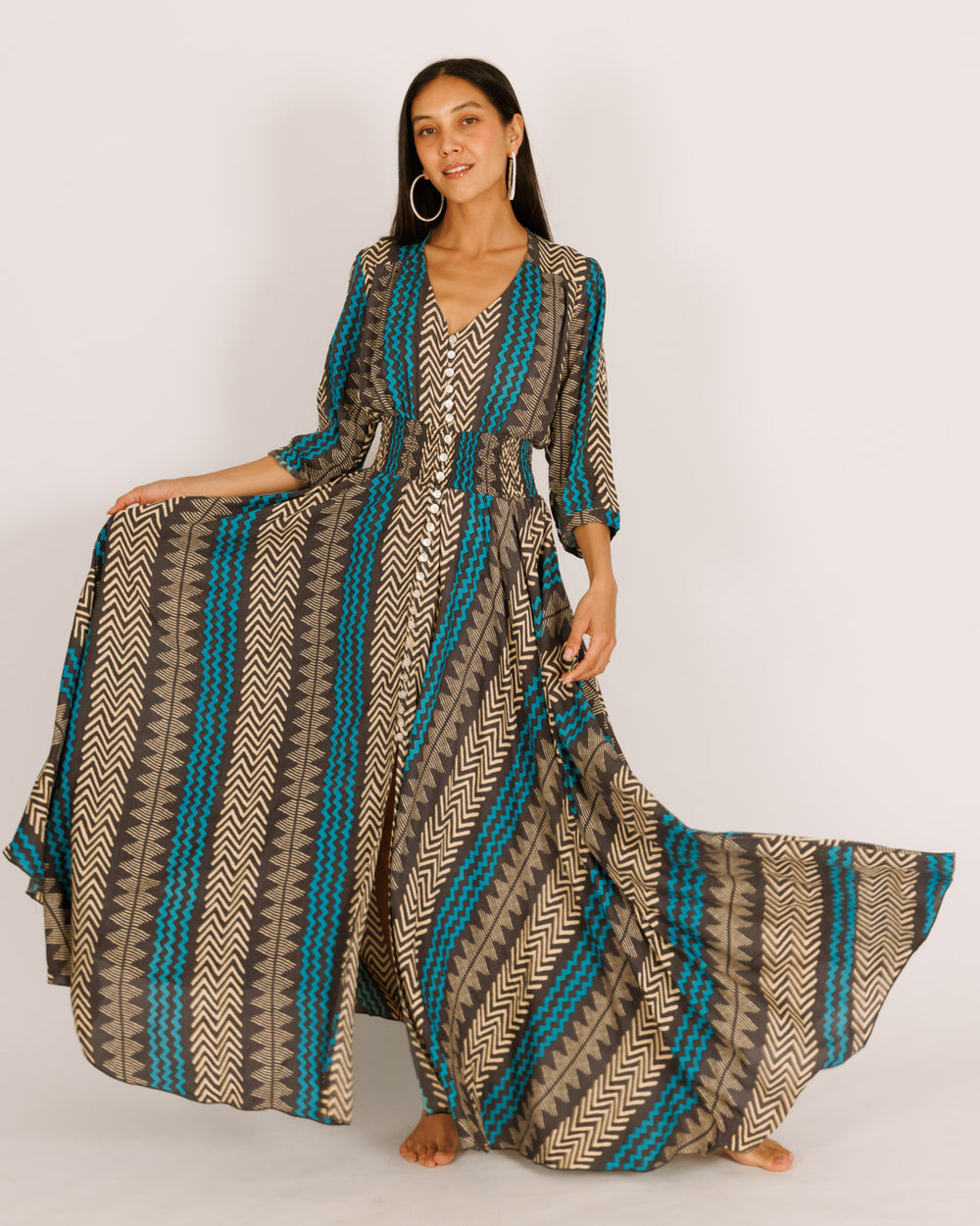 • שמלת מקסי דרמטית וסקסית, שחורה עשויה ויסקוז בהדפס אדום/כחול/ירוק שבטי ומגניב במיוחד, מבטיחה לך מראה מלא סטייל וקלאסיות לכל מאורע: תוכלי ללבוש אותו עם האקססוריז הנכון החל מחוף הים, בית קפה עם חברה ועד חתונה.