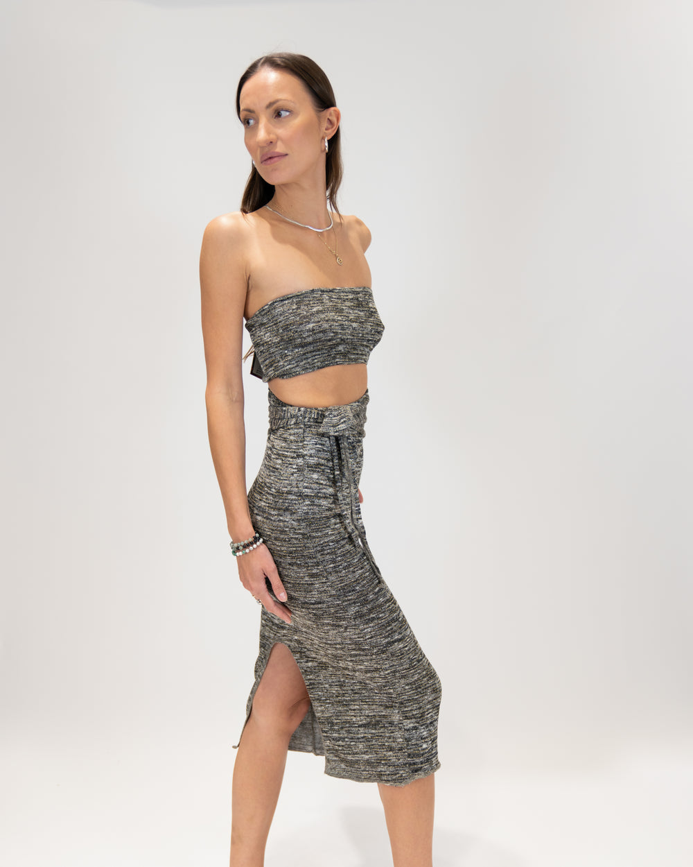 שמלה סטרפלס כותנת לייקרה, אפורה כהה, שקופה, שסע קדמי