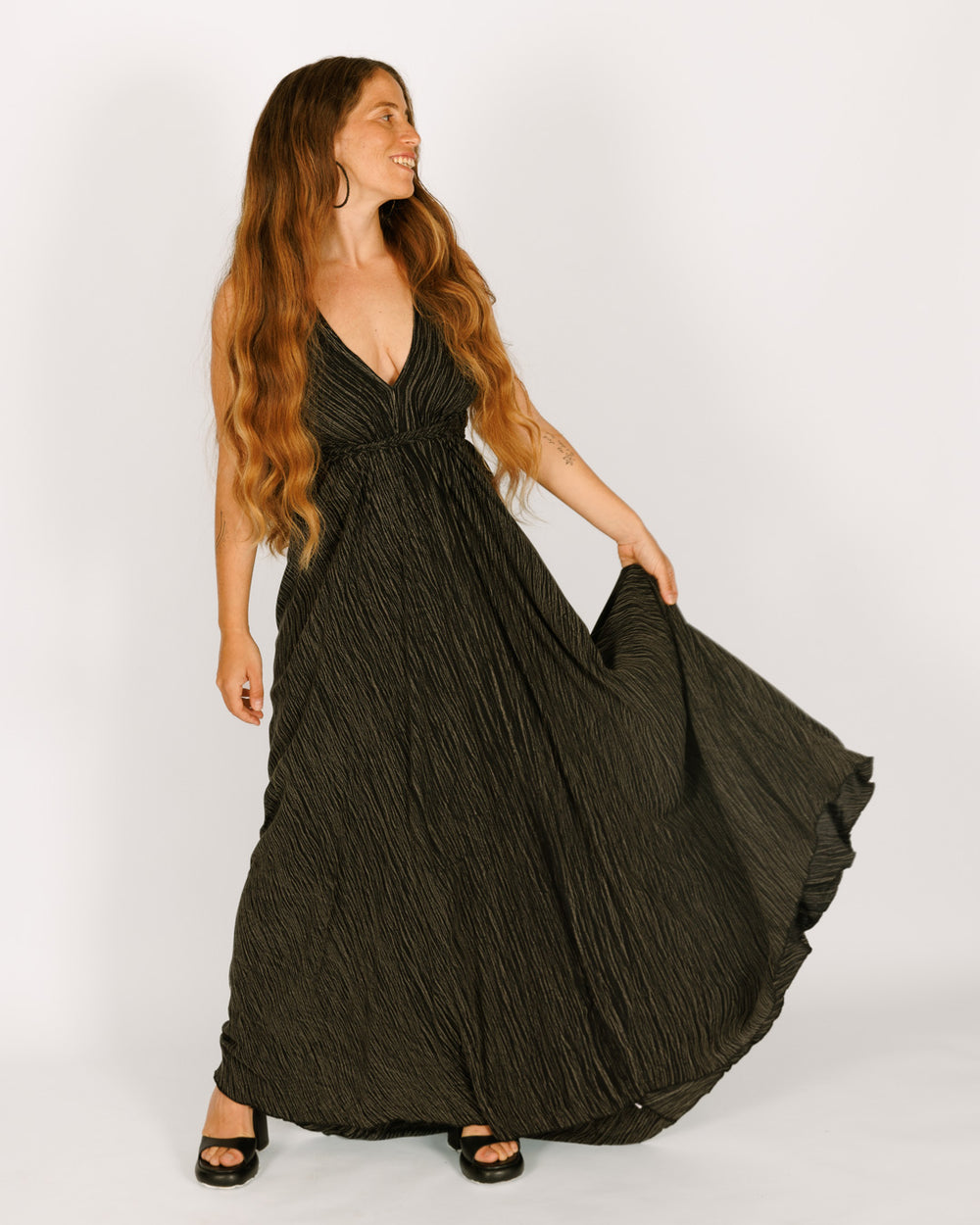 • שמלת מקסי קרפ שחור משופשף עשויה ויסקוז, בצביעה משופשפת, היוצרת מראה אורבני מלא סטייל ושיק.