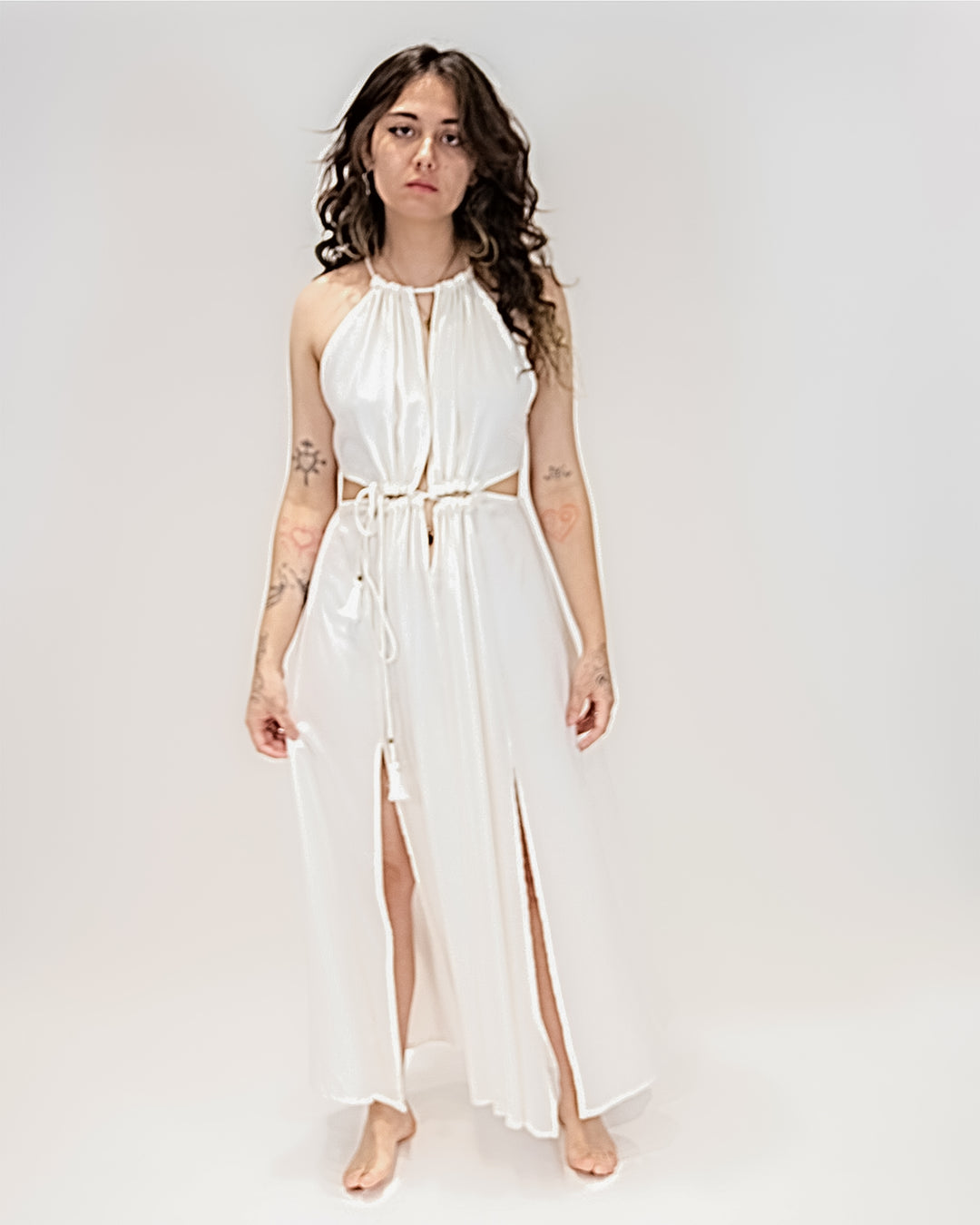 שמלת מקסי קשירה מלמלה לבנה אלמוג זהב