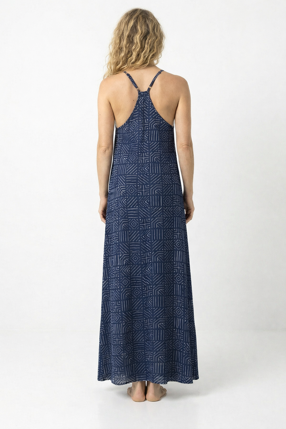 שמלה מקסי ויסקוז כחולה, שסעים, בהדפס שבטי לבן