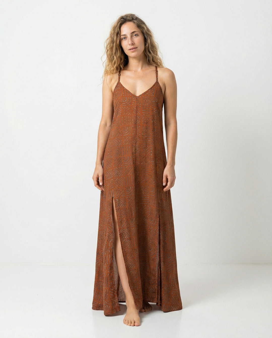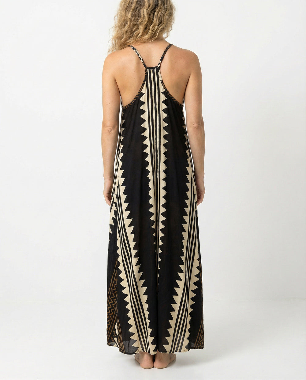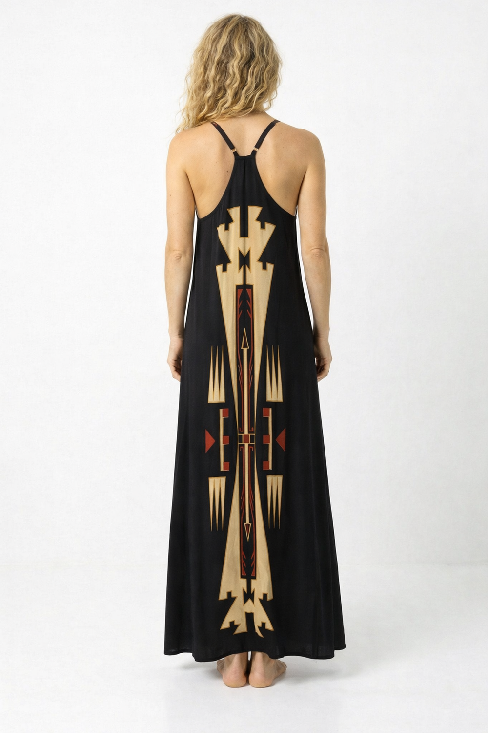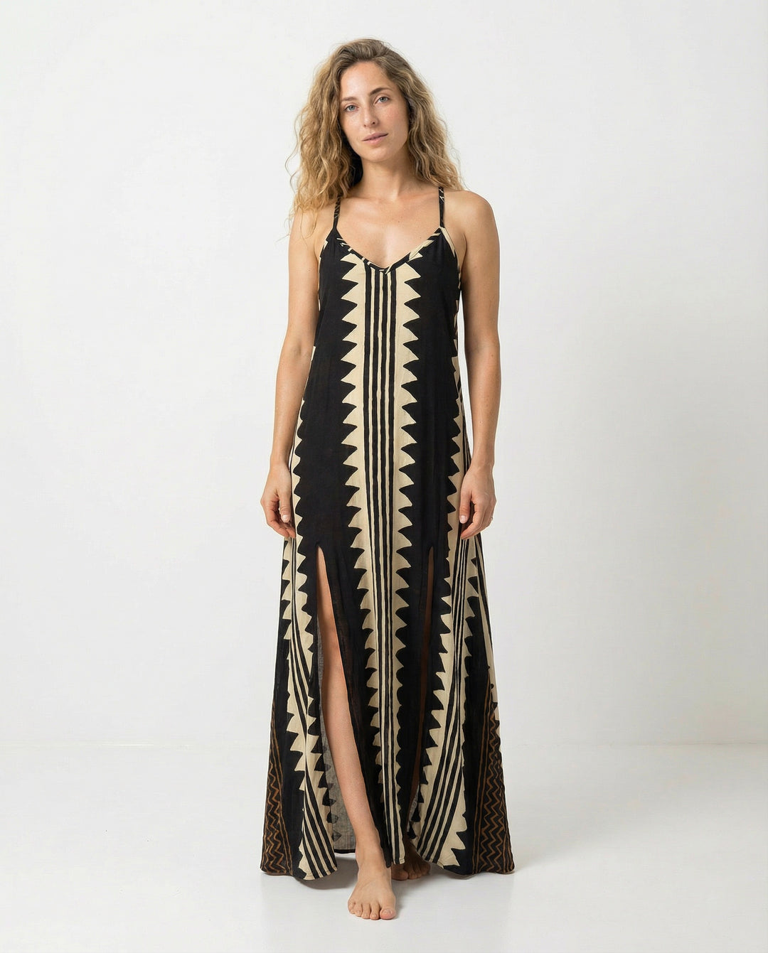 שמלה מקסי ויסקוז שחורה, שסעים, בהדפס פסים שבטי