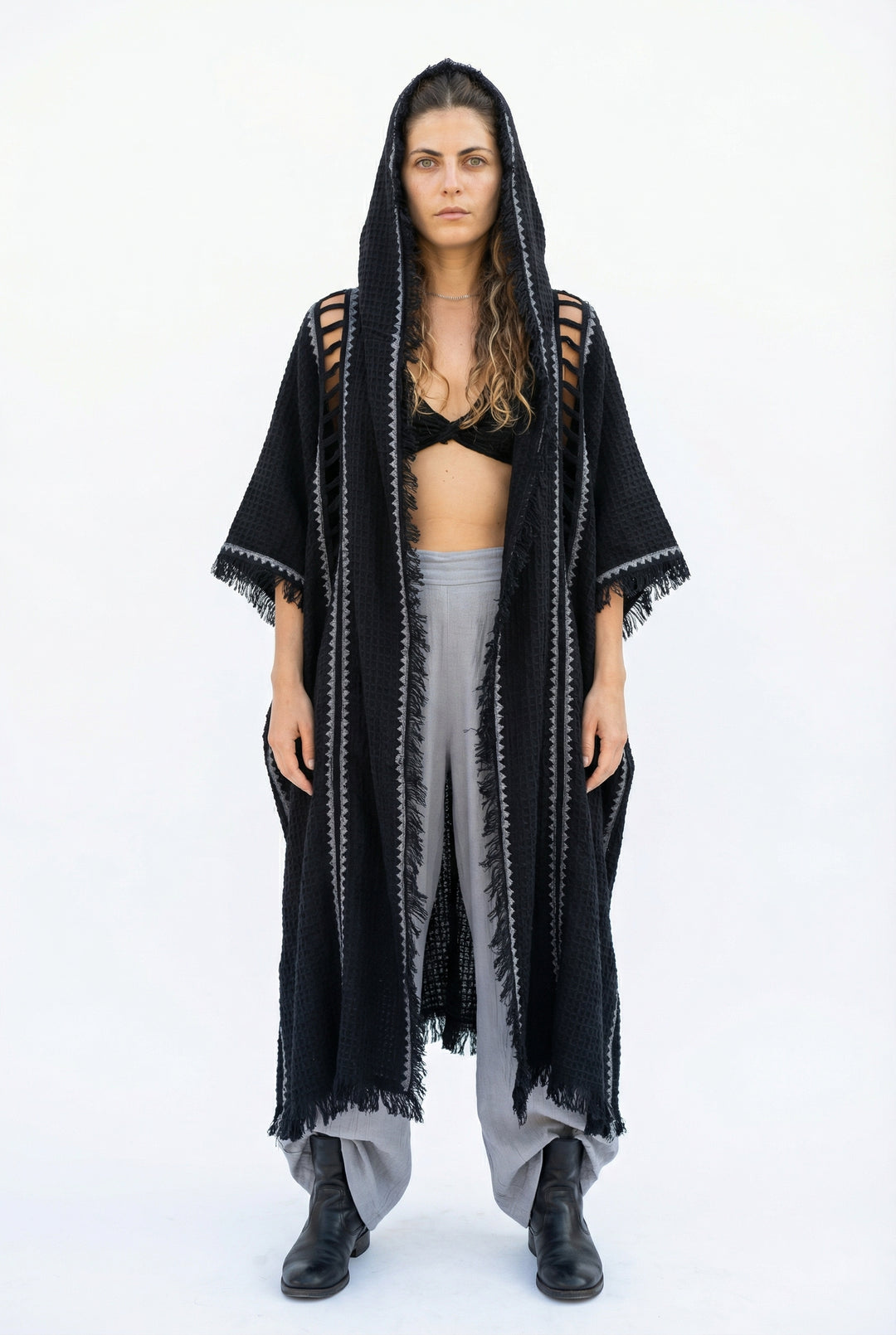 קימונו פיקה שחור מחמם עם כובע לאישה