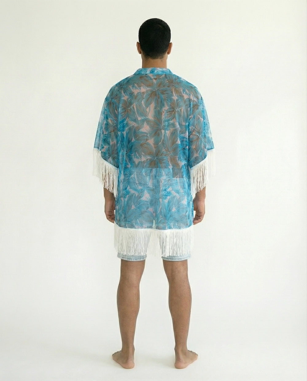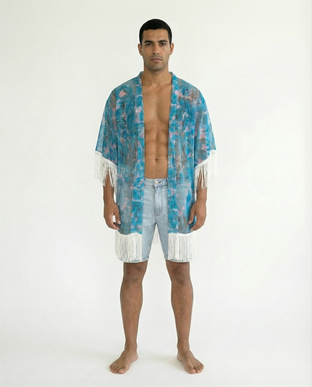 עליונית/ קימונו פרנזים, רשת, כחול-לבן פרחוני לגבר