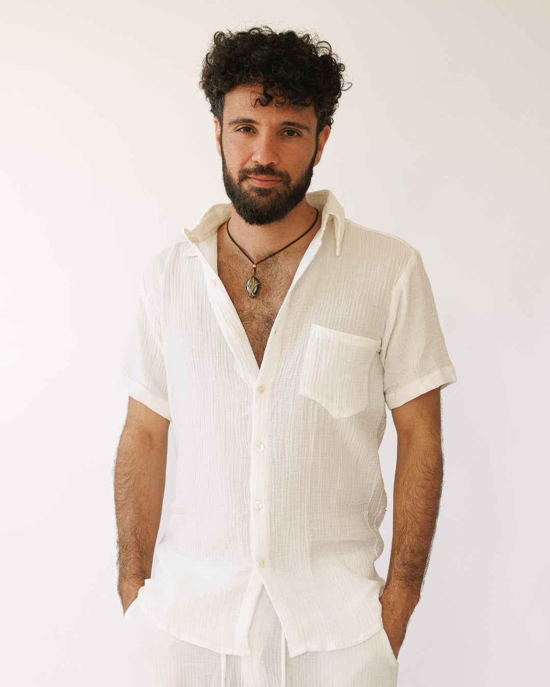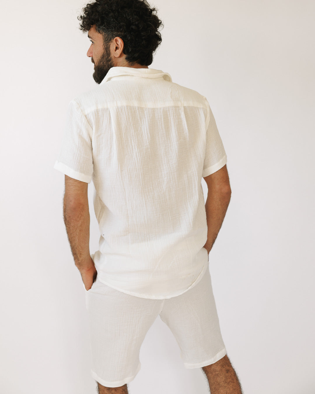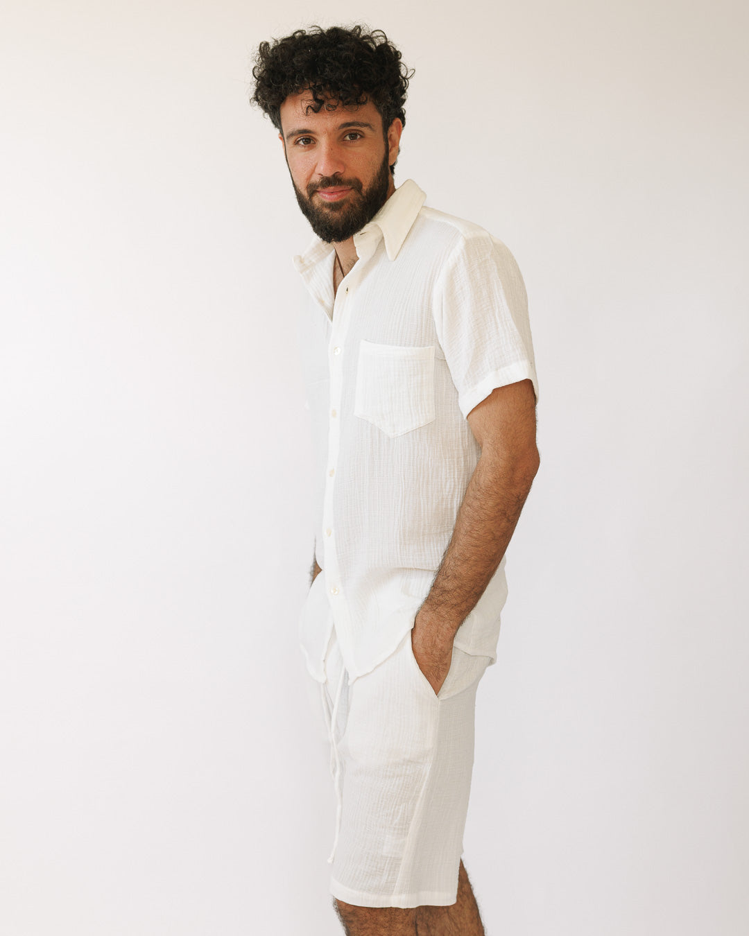 סט: מכופתרת קצרה עם כיס + מכנס כותנה קצר, מעוטרת משבצות עדינות, לבנה לגבר