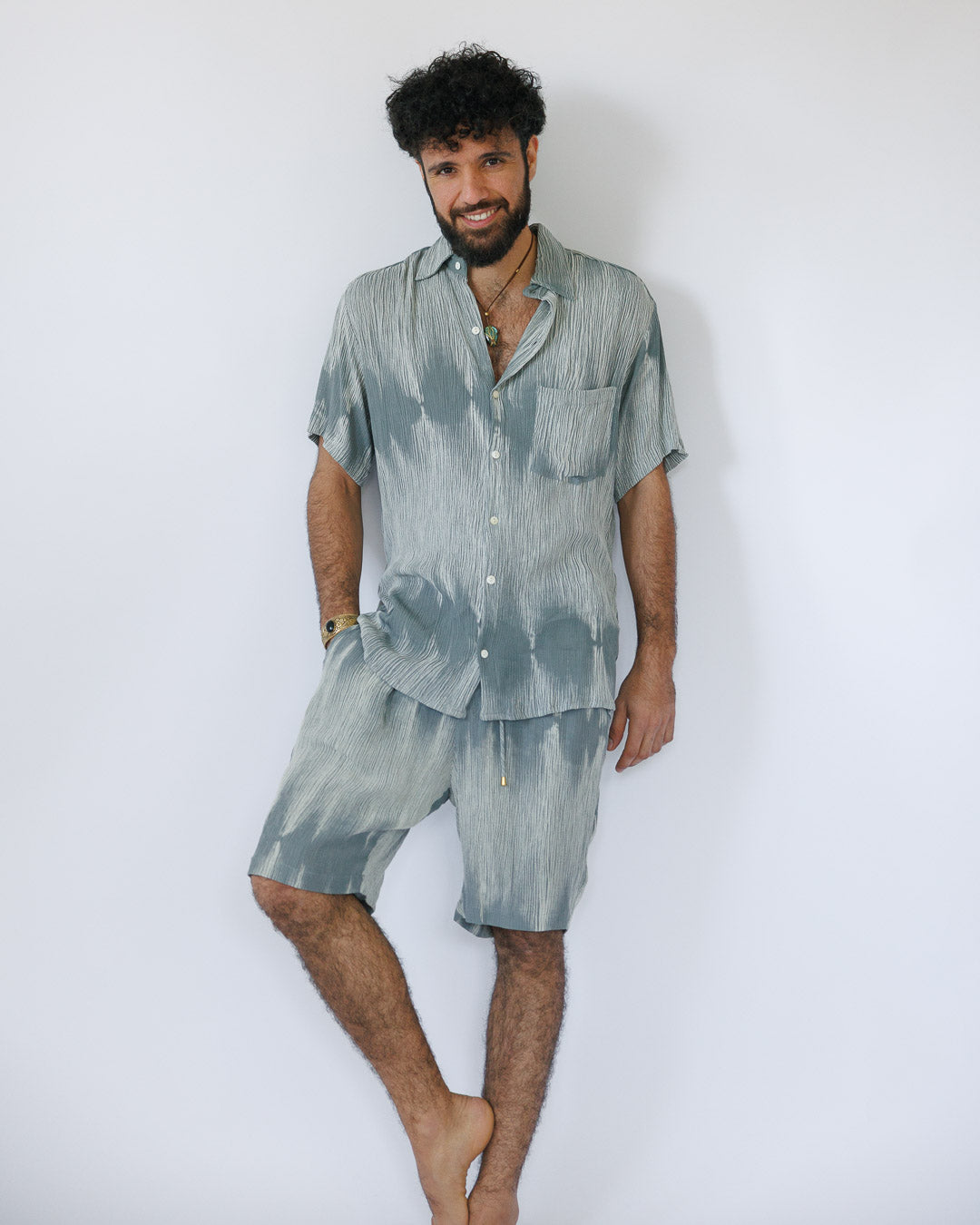 סט: מכופתרת קצרה עם כיס + מכנס קצר בצביעה משופשפת אפור לגבר