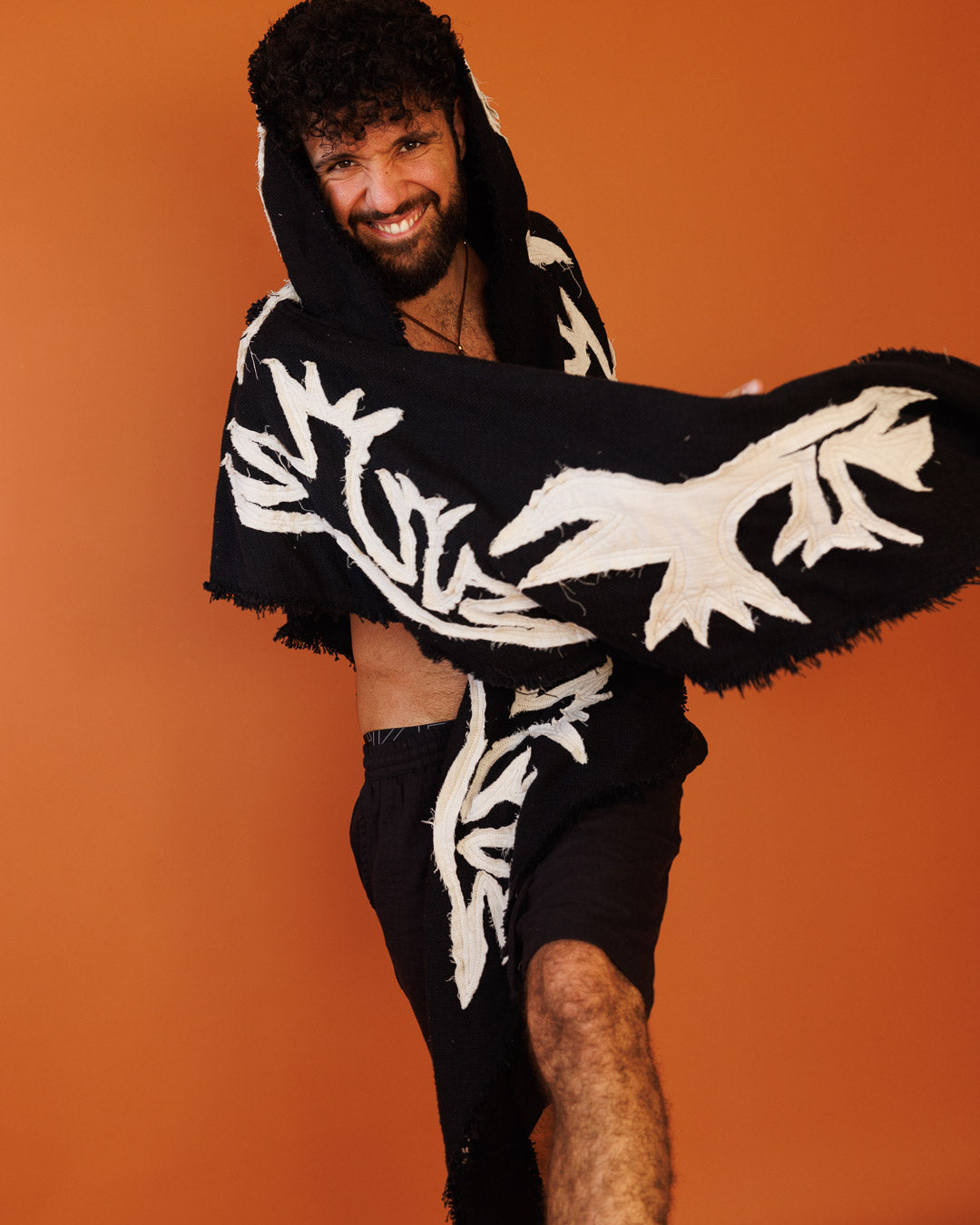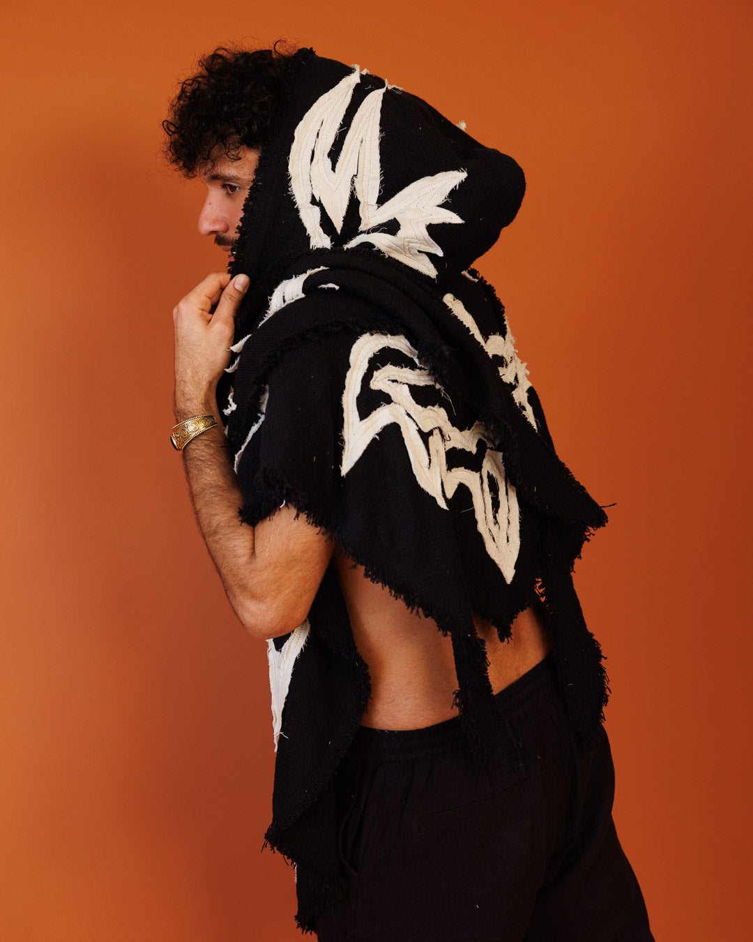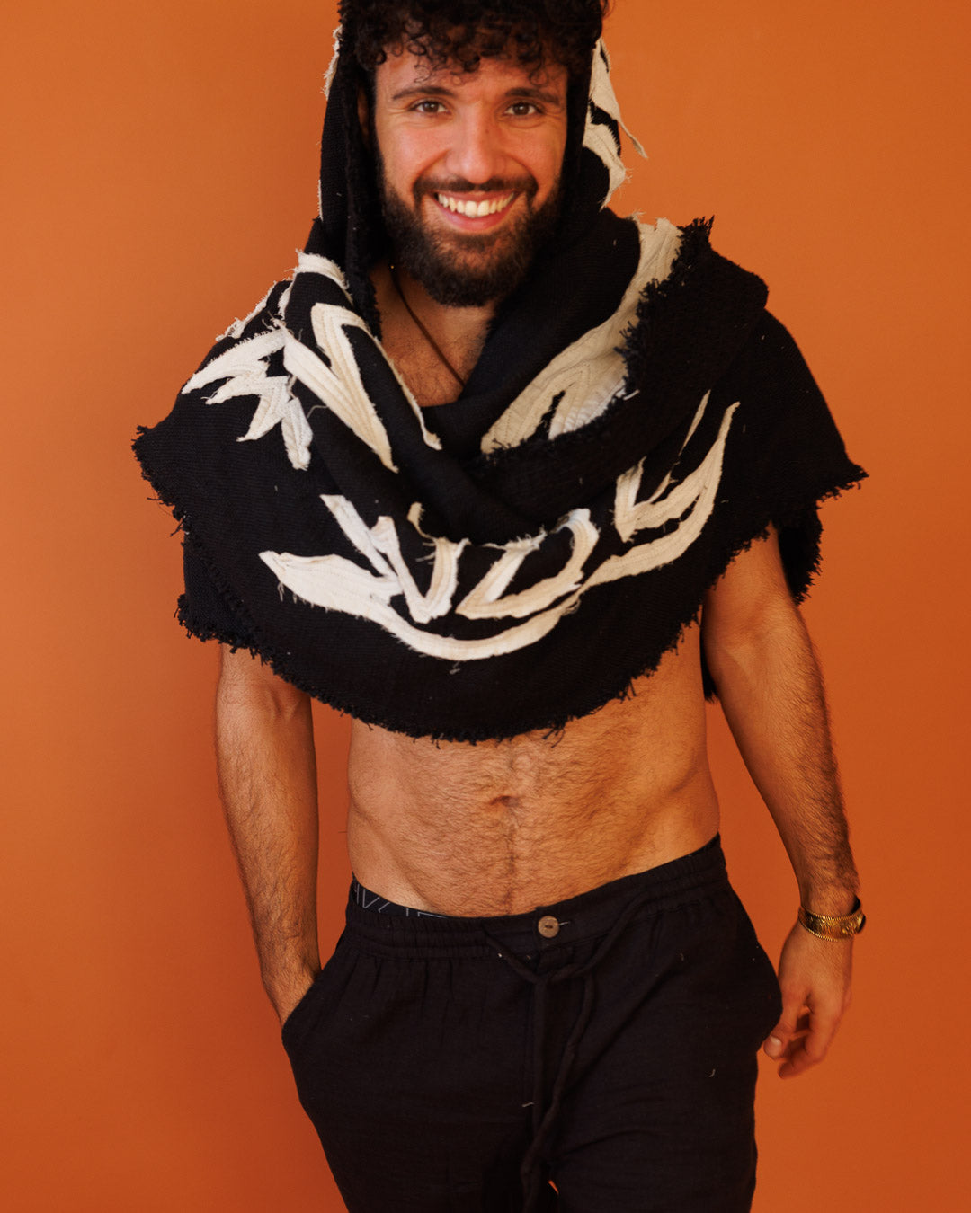 צעיף־כובע שמנת טקסטורלי (נלבש גם כפונצ׳ו/וסט): פריט שכבה ייחודי שמחליף מעיל קל. טקסטורת כותנה טבעית עם שוליים פרומים ועיטור תפירת טקסטורות בד צהבהב עדין שנותן עומק ועניין — וייב מדברי־בוהו נקי. אפשר ללבוש כצעיף כובע, כפונצ׳ו פתוח או כוסט שכבות מעל כל לוק.