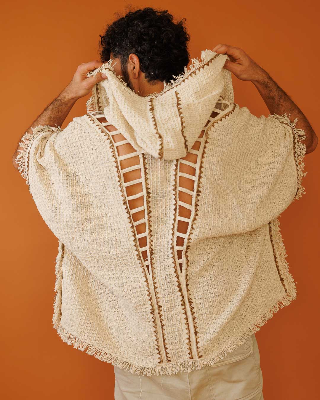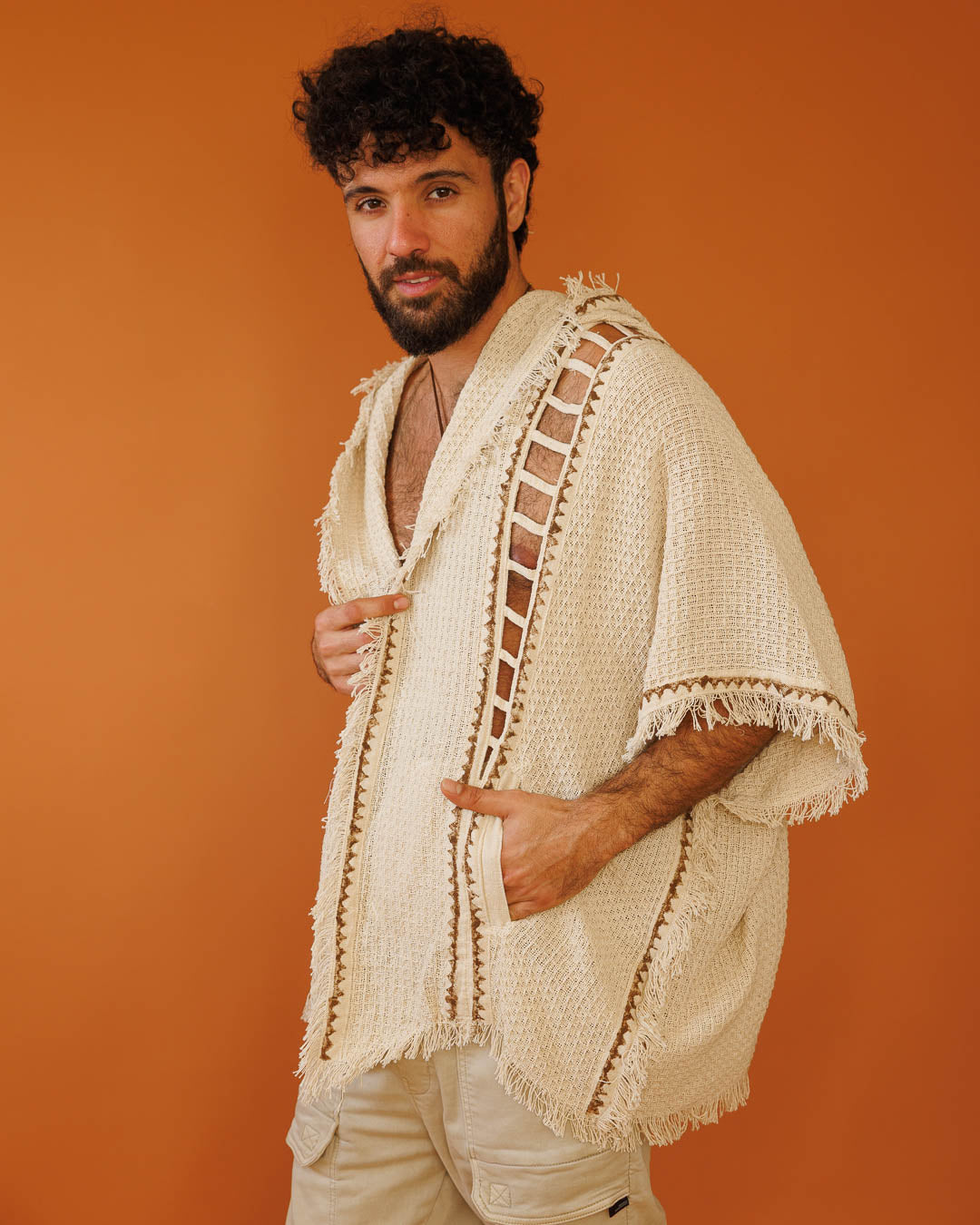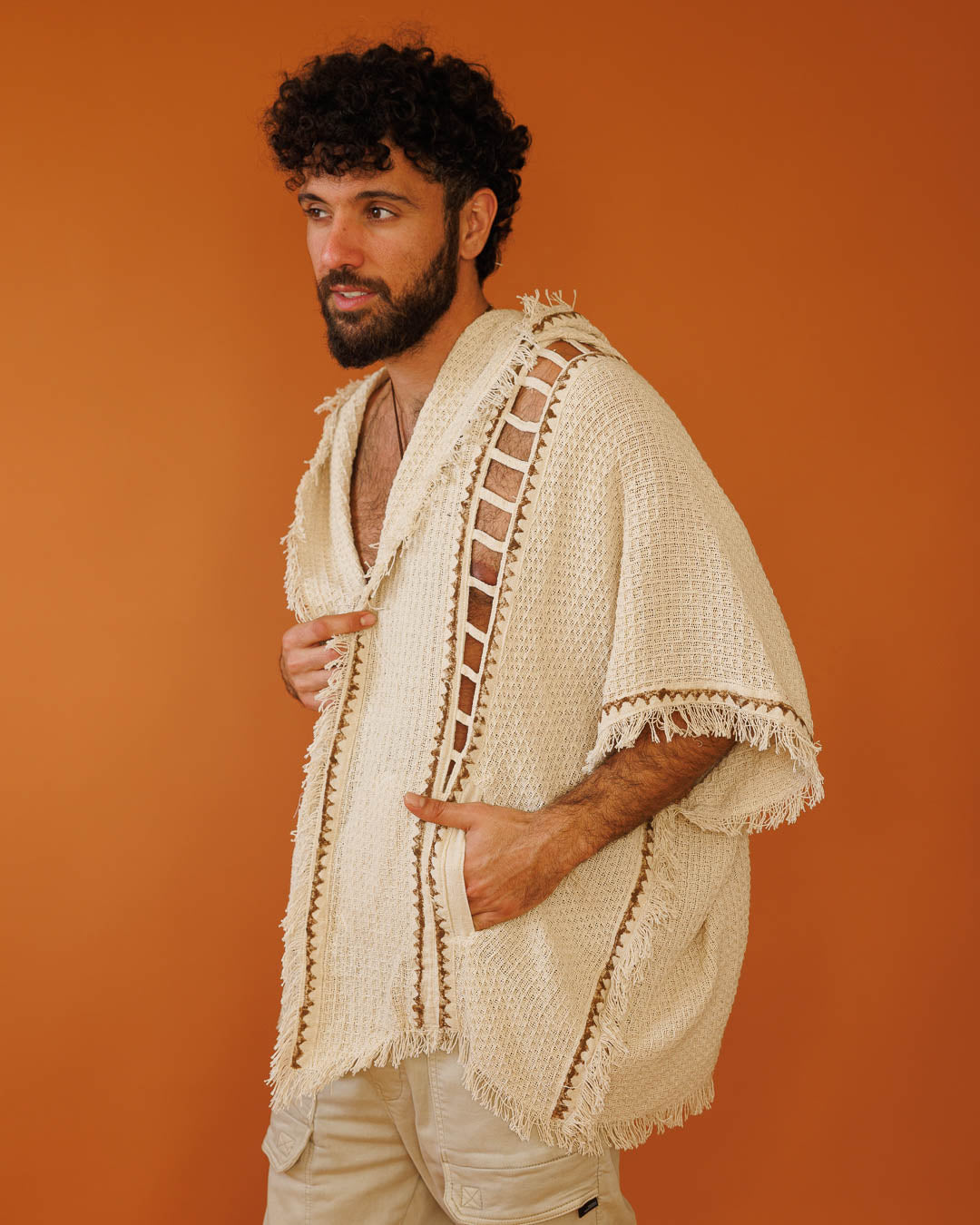 קימונו קצר נטורל עשוי כותנת פיקה איכותית, עם הדפס בלוק־פרינט ידני בעבודת חותמות עץ חומה. פריט גברי עם נוכחות חזקה — שילוב של בוהו, אדג׳יות ואלגנטיות מחוספסת. הגזרה פתוחה וזורמת, עם תנועה דרמטית ונפילה חופשית שמרגישה טבעית על הגוף.