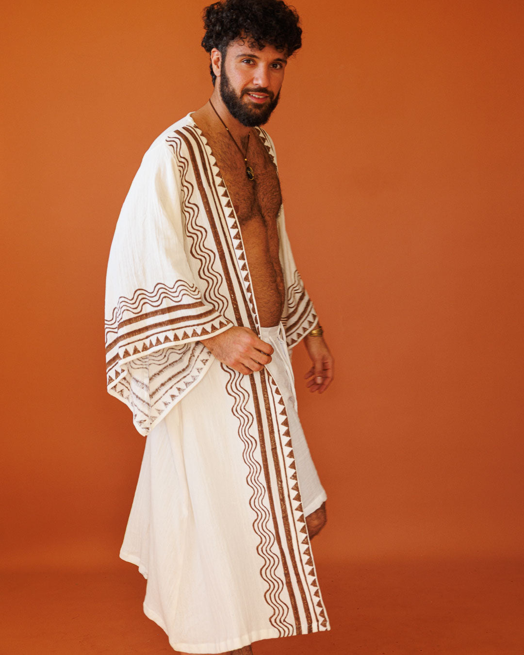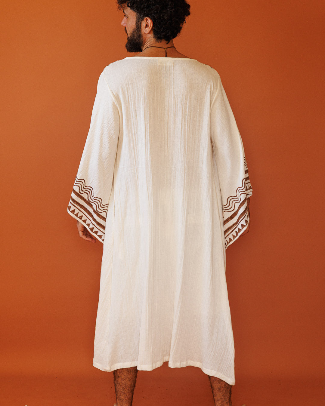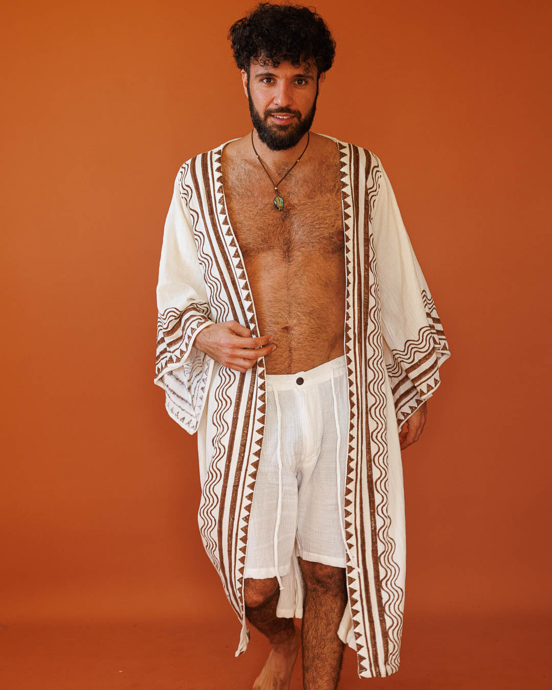 קימונו מקסי, כותנה רכה לבנה ושבטית, שרוול ארוך, בהדפס חותמות עץ ידני לגבר