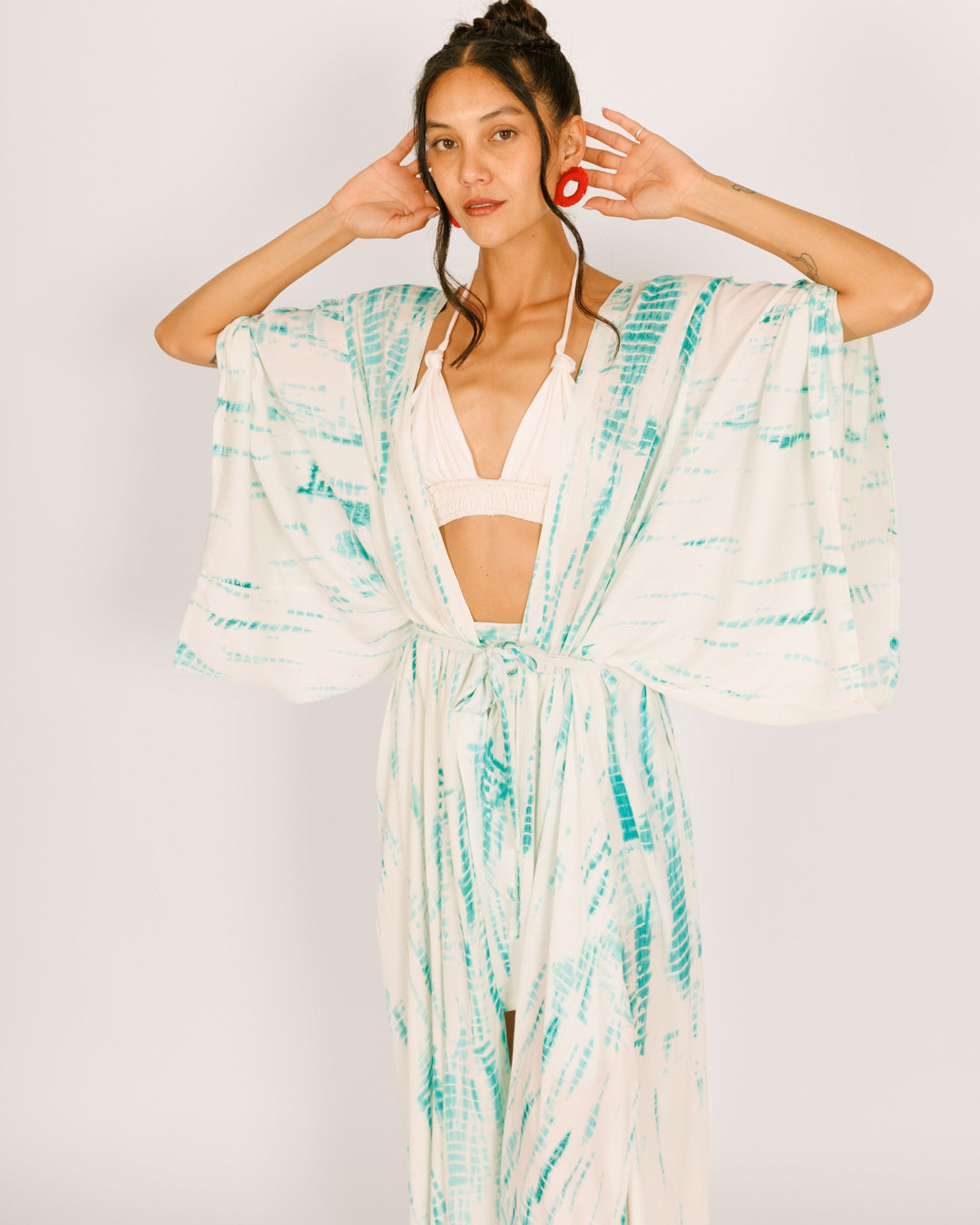 חולצת בטן מעטפת לבנה , קורל זהב, שרוול ארוך מתרחב