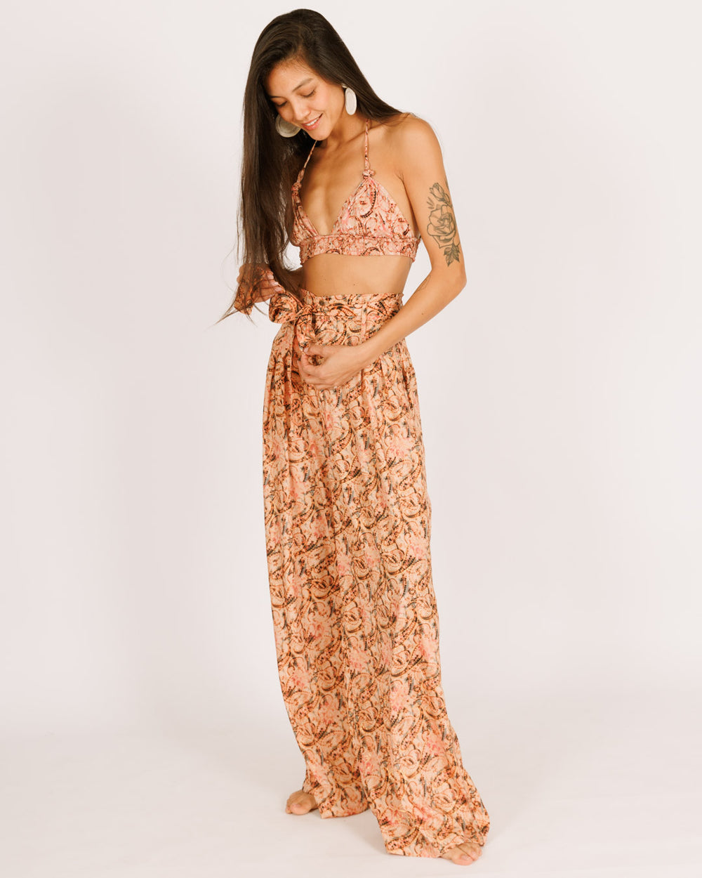 סט: טופ משולשים + מכנס אלגנטי, משי ורוד כתמתם