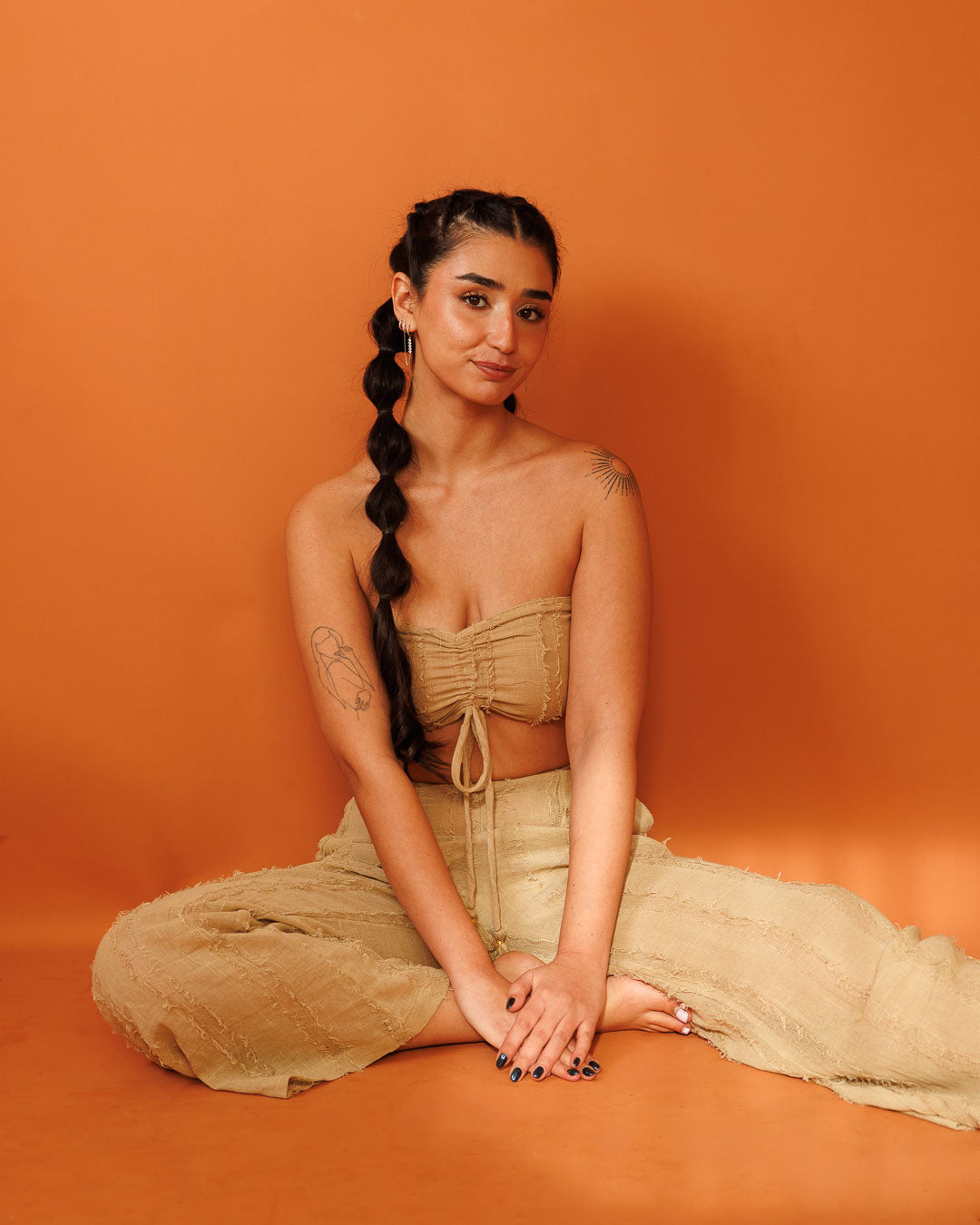 סט: טופ סוכריה סטרפלס, כותנת פרנזים חאקי + מכנס ארוך, כותנת פרנזים חאקי