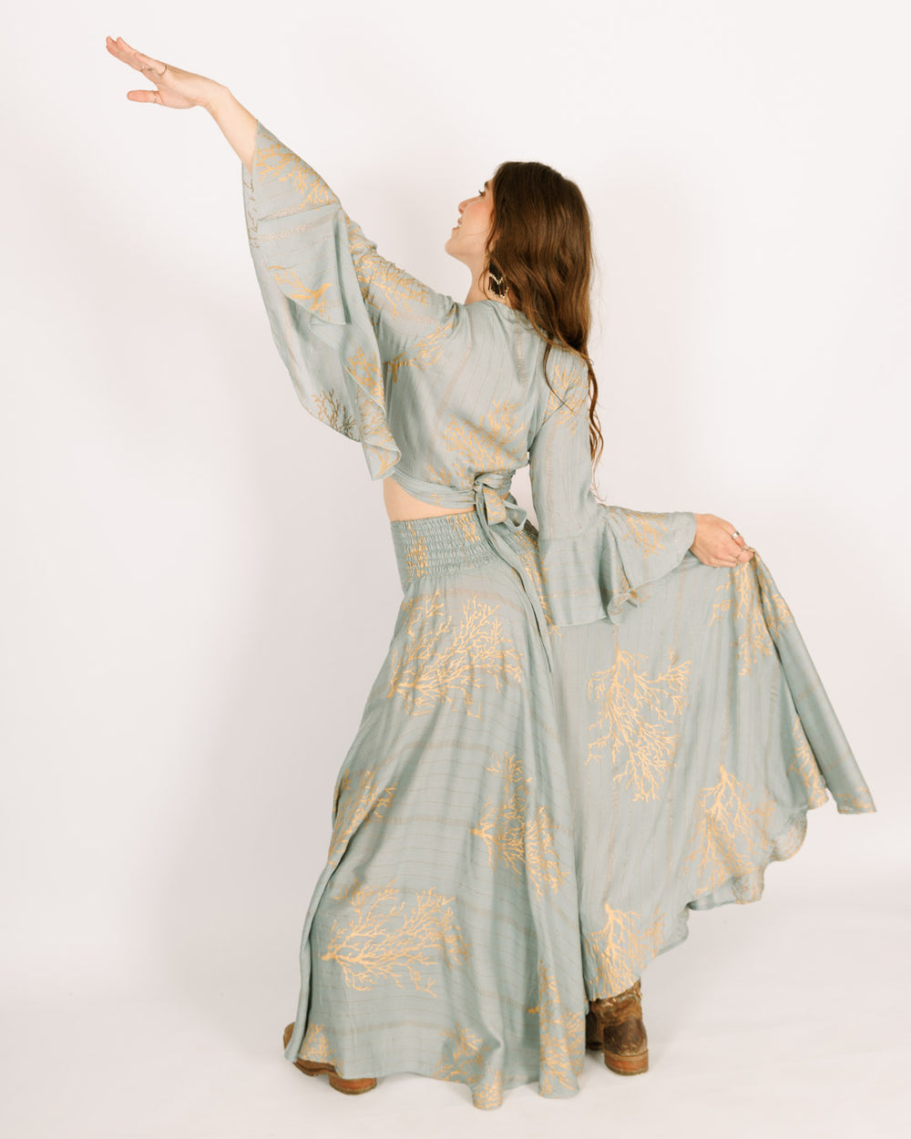 סט: חולצת בטן מעטפת +מכנס מטריה ארוך, תכלת אלמוג זהב