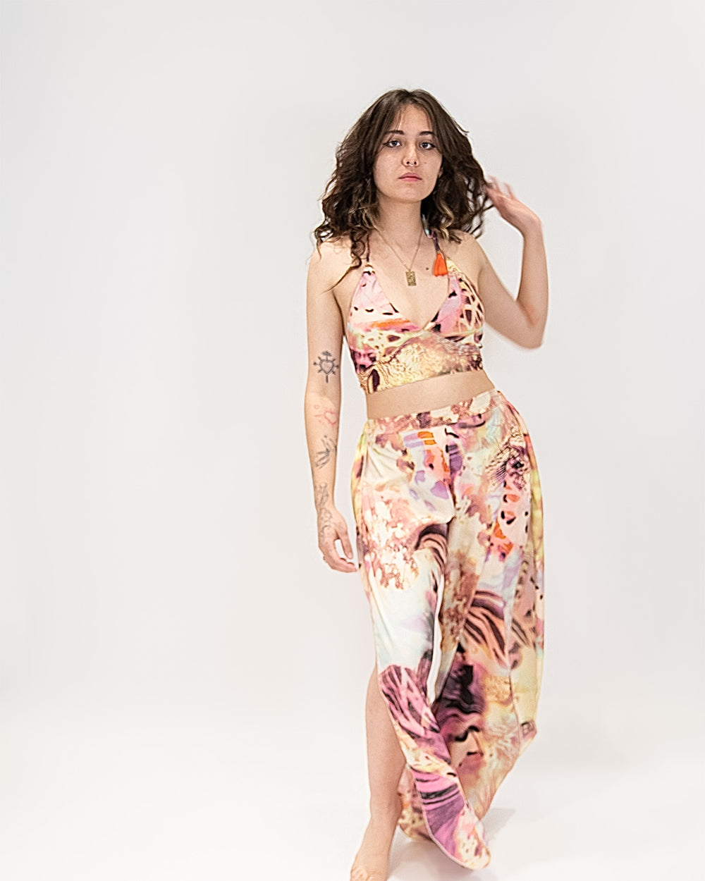 סט: טופ דו צדדי + מכנס שסעים צדדים, משי ורוד פרפרים