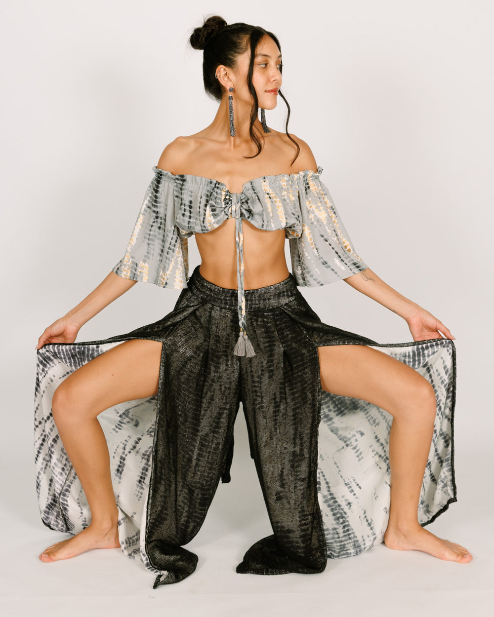 סט: טופ כיווץ חזה + מכנס ארוך רשת שסעים, לבן טאי דאי אפור וזהב