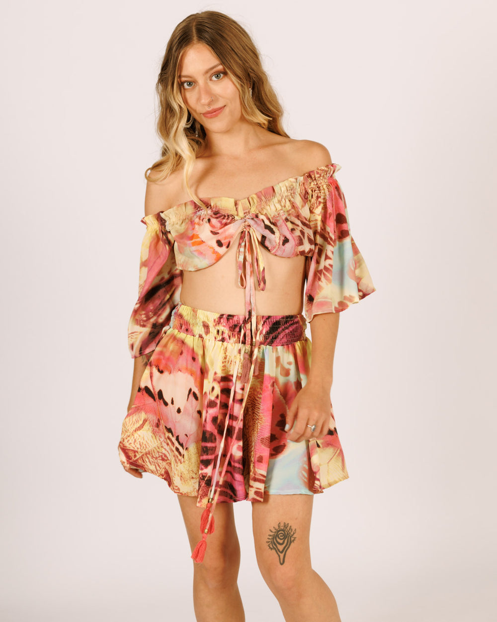 סט: טופ כיווץ + מכנס מטריה מידי, פרפר ורוד