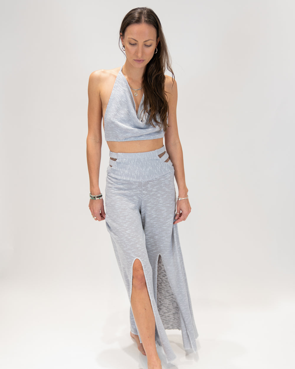 - סט טופ ומכנס מושלם בצבע אפור בהיר/ תכלת, מכותנת לייקרה- הבד נעים, מחמיא, שקפקף וסקסי!