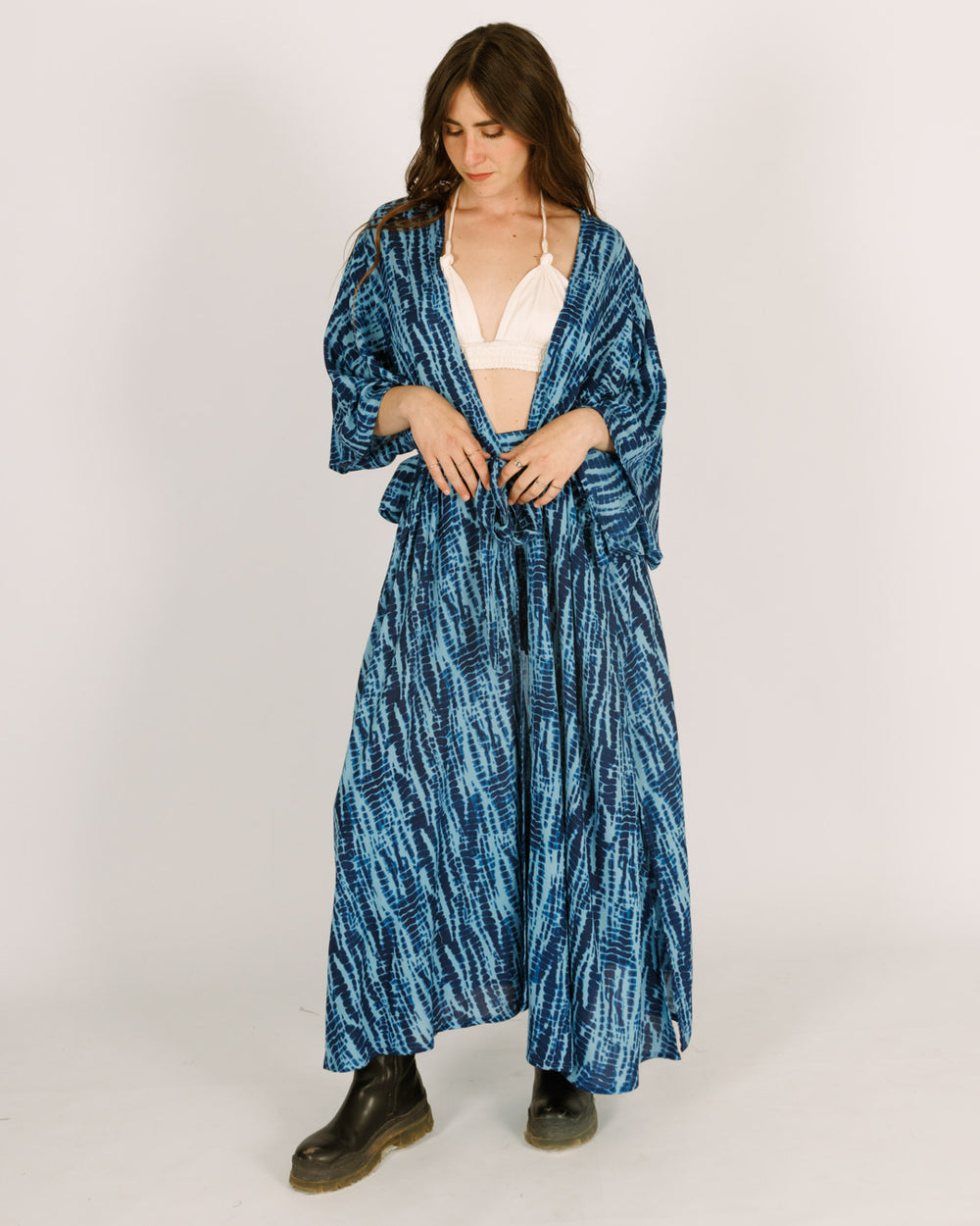 סט: קימונו מקסי + מכנס קצר, כחול טאי דאי שחור