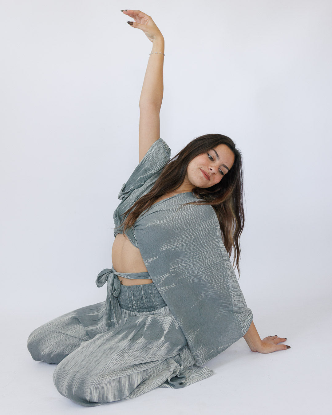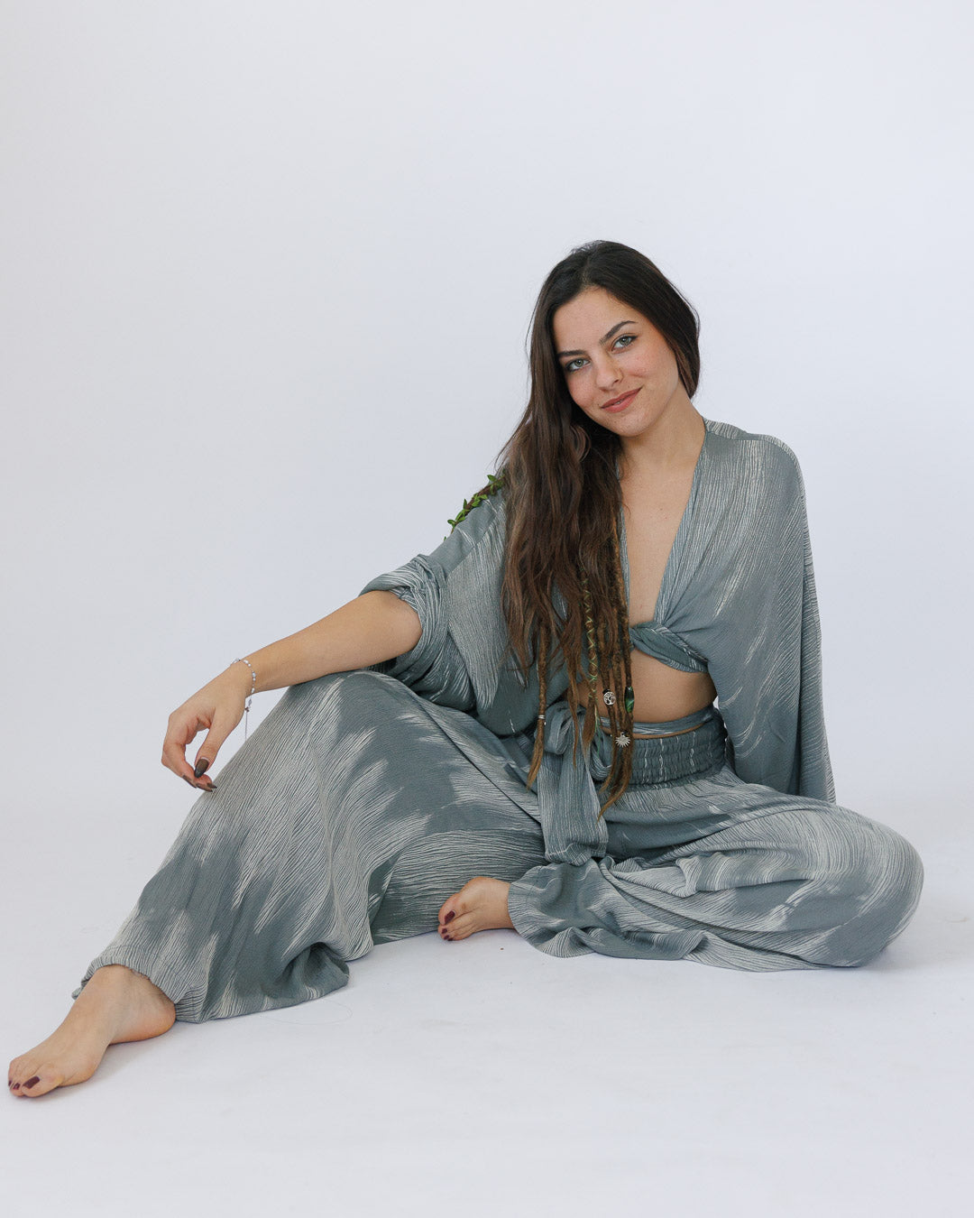 סט בוהו־פרימיום בצבע אפור/ קאמל משופשף שמרגיש כמו חופש על הגוף — חולצת קשירה נשפכת עם שרוולים רחבים ומכנס בגזרה זורמת עם גומי נוח. הבד הוא ויסקוז קרפ בצביעת שטיפת אבן, שנותנת מראה “משופשף” וכפלים טבעיים מהממים — רך, נושם, ונעים ברמה שאת לא תרצי להוריד. הכי כיף? זה סט שעובד לכל מקום: יום־יום, משרד, חברה, וגם בר בערב — רק מחליפים אקססוריז.