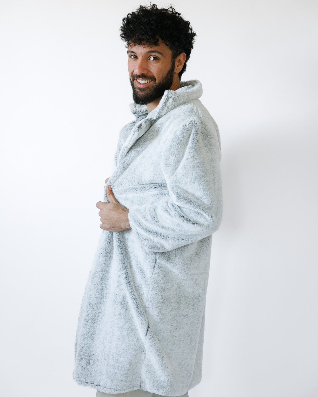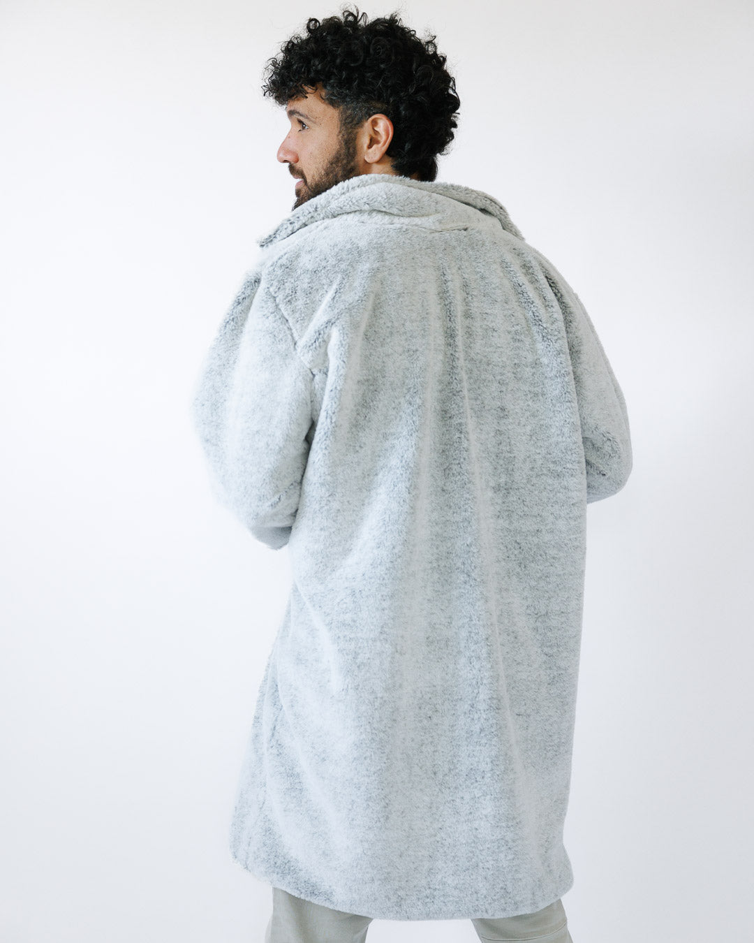 מעיל פרווה סינטטית רכה במיוחד בגוון אפור־בהיר, עם צווארון רחב ונפילה אוברסייזית רגועה. פריט יוניסקס מחמם, נעים ומלטף — כזה שאפשר להתעטף בו ולצאת מהבית בתחושה של שמיכה, בלי לוותר על סטייל נקי ומדויק.