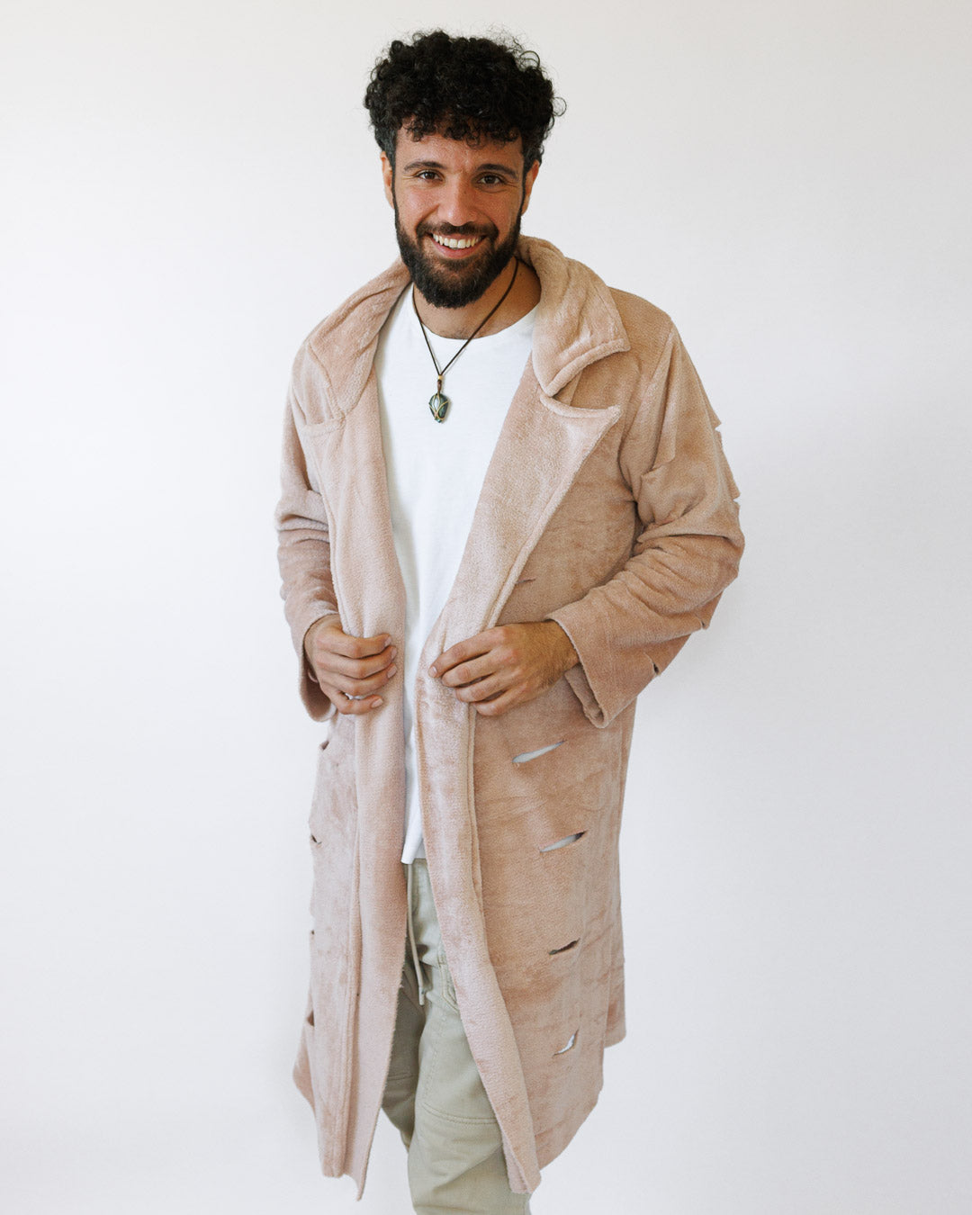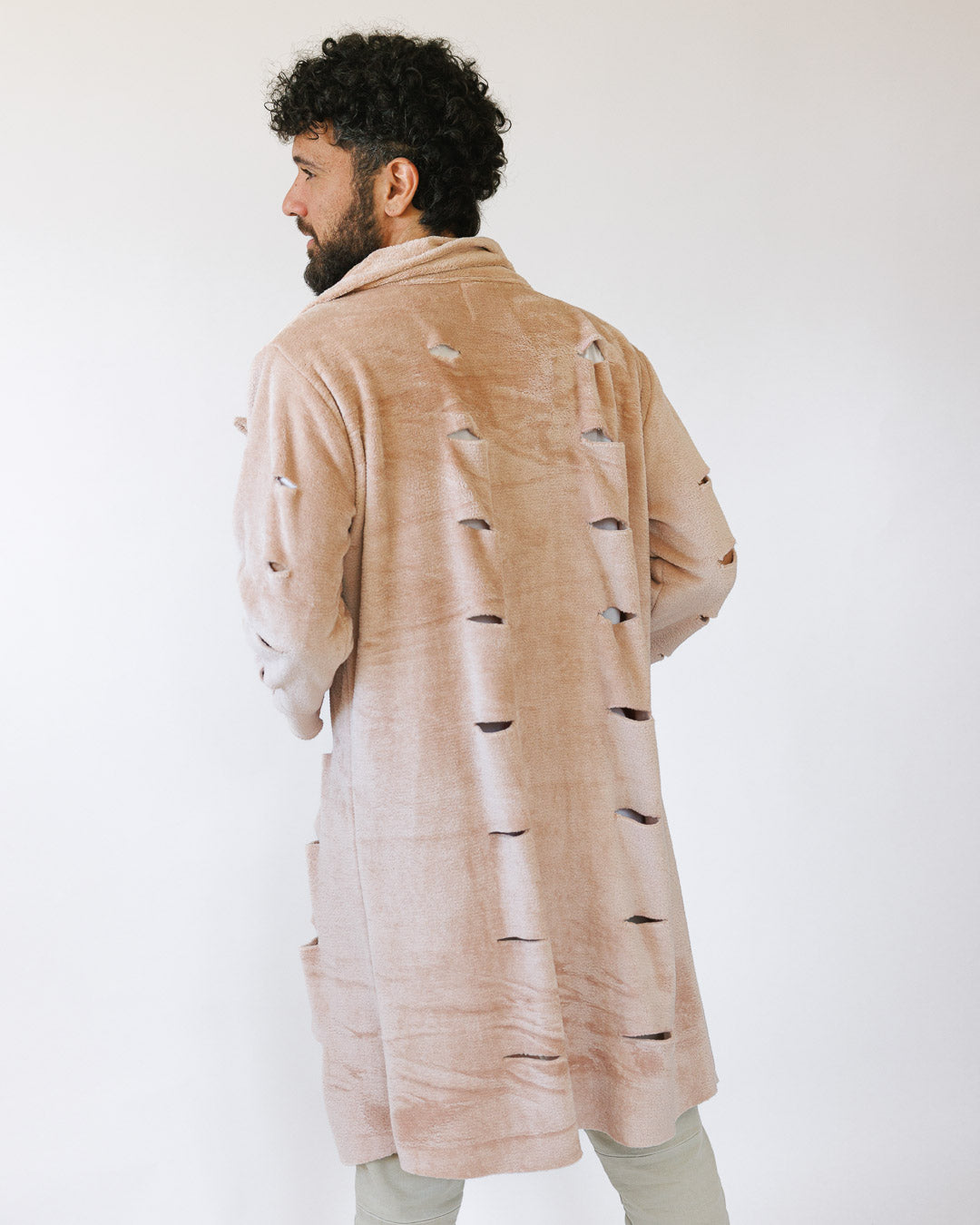 מעיל פרווה סינטטית רכה במיוחד בגוון ניוד־בהיר, עם צווארון גדול וטוויסט של “קרעים” דקורטיביים שנותנים לו לוק בוהו־אדג׳י. אוברסייז מחמם שנלבש פתוח ומקפיץ כל הופעה.