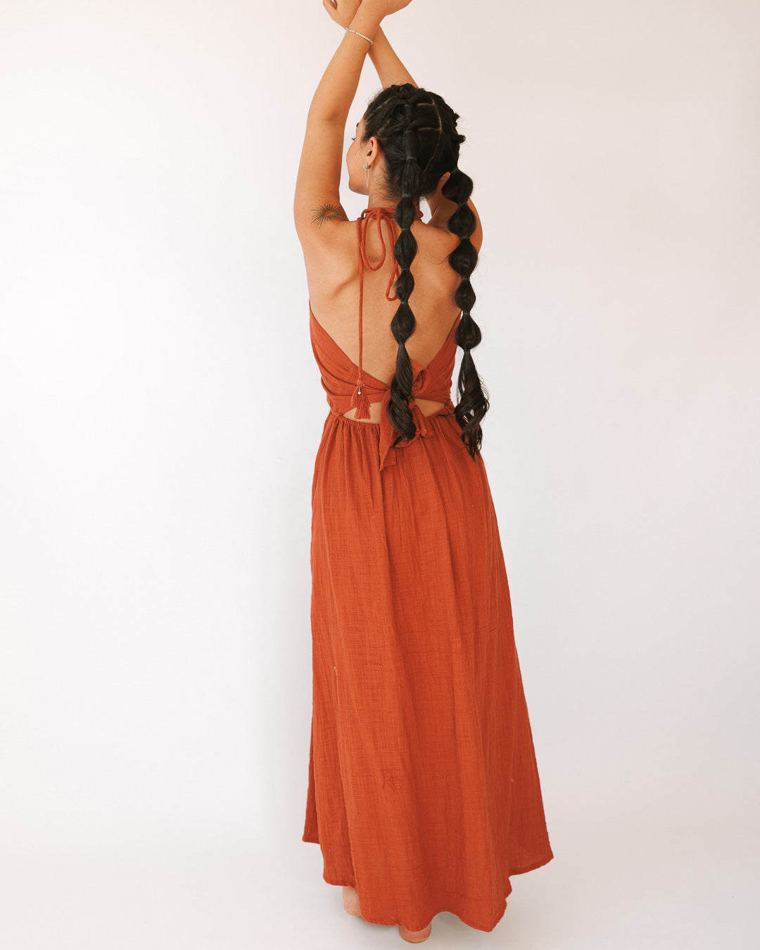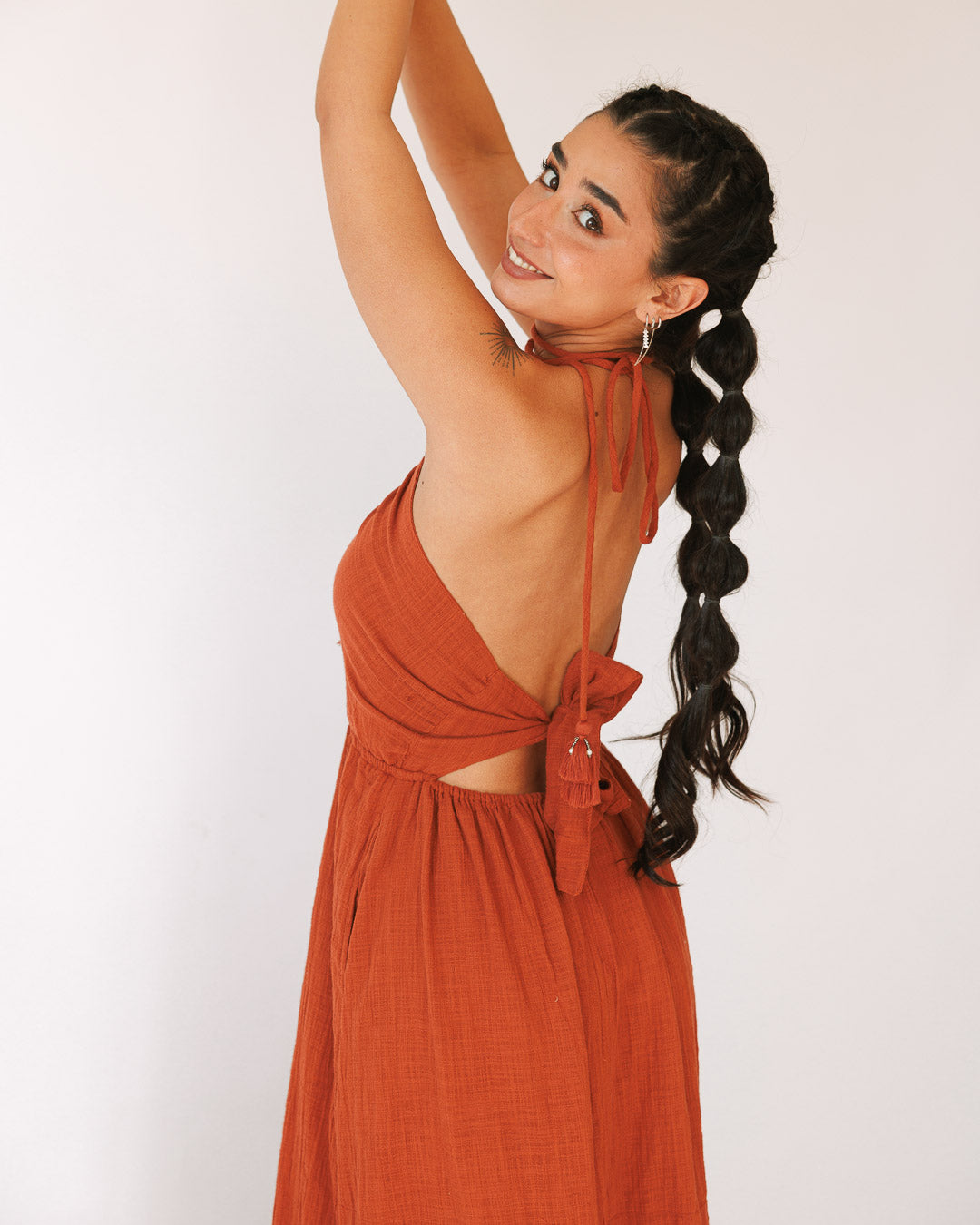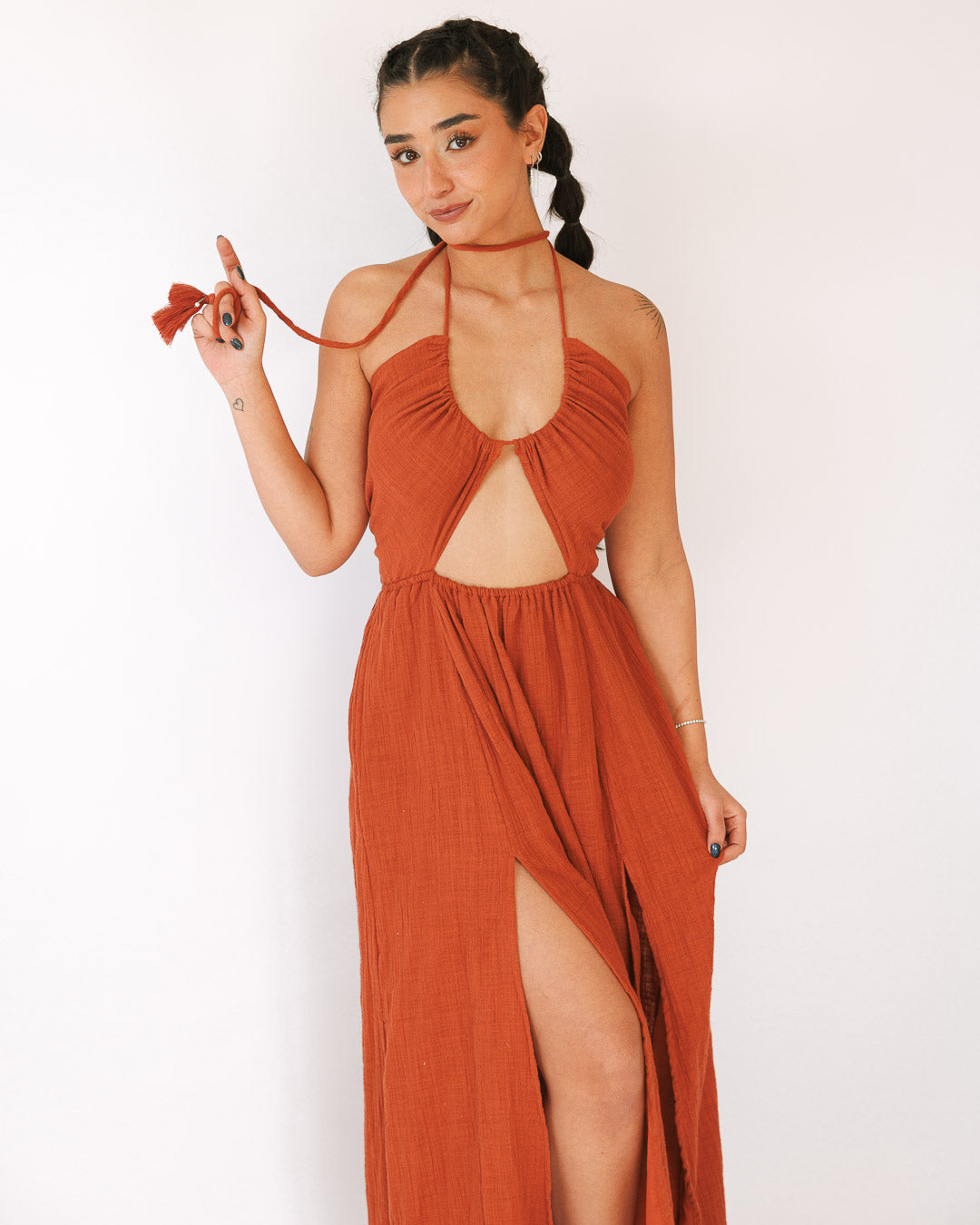 שמלת קיץ בוהו־פרימיום שמרגישה כמו חופש על הגוף — הלטר מחמיא עם גב פתוח, מותן גומי שמסתדרת עלייך בקלות, ושסעים שמכניסים תנועה. הטוויסט: טקסטורת הבד המושלמת + פרנזים דו־שכבתיים יוקרתיים עם חרוזים שנותנים לה מראה עשיר ולא “עוד שמלה”.