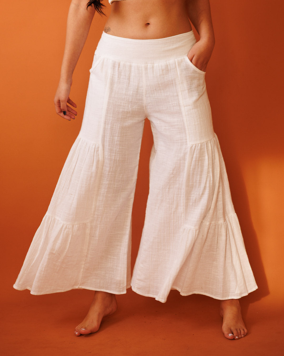 מכנס בוהו־אווירירי עם רגל רחבה ונפילה רכה, שמשלב נוחות של גומי במותן עם וייב רומנטי של מלמלות. פריט מושלם לימי קיץ, חופשות ופסטיבלים – קליל, זורם ומרים לוק בשנייה.