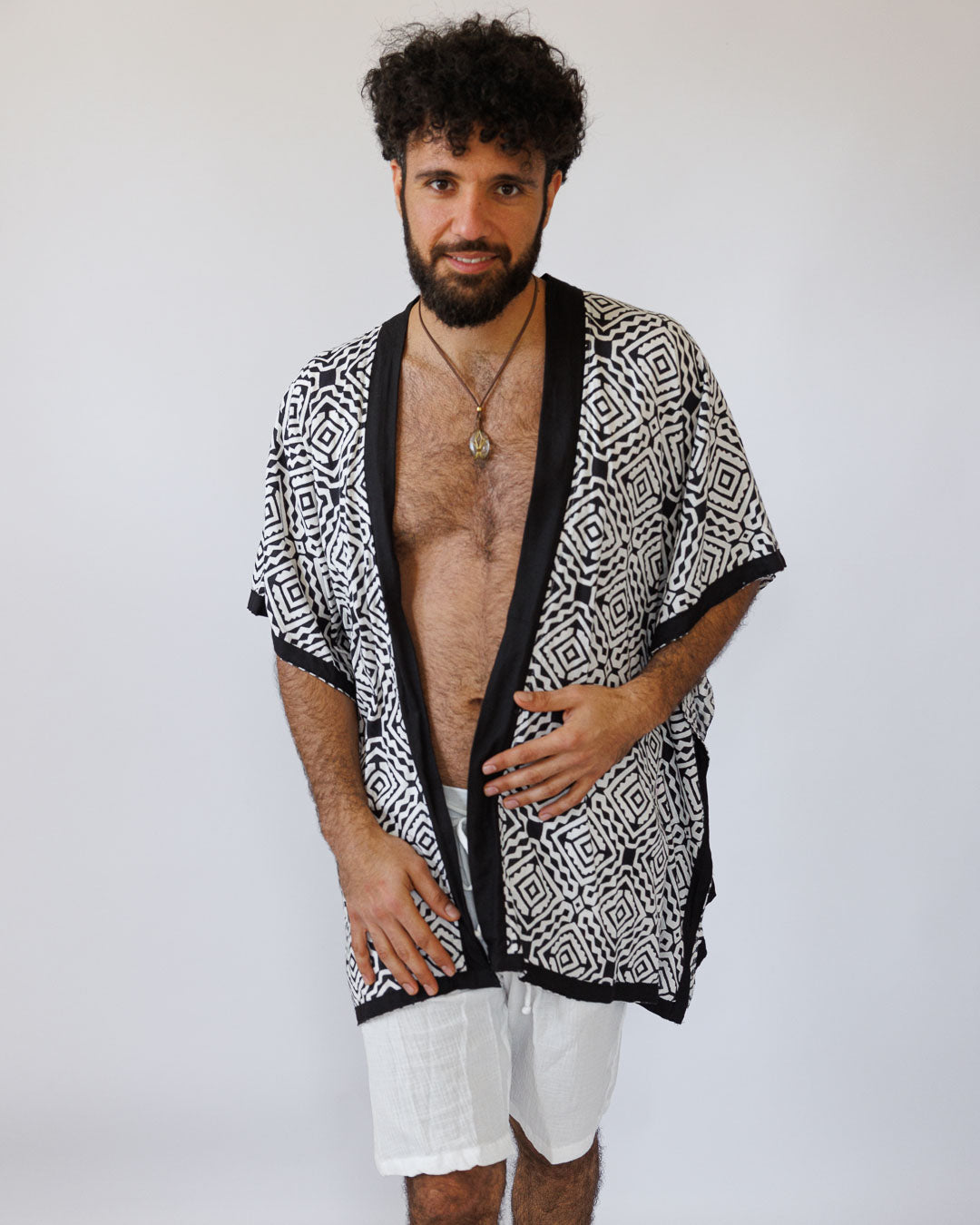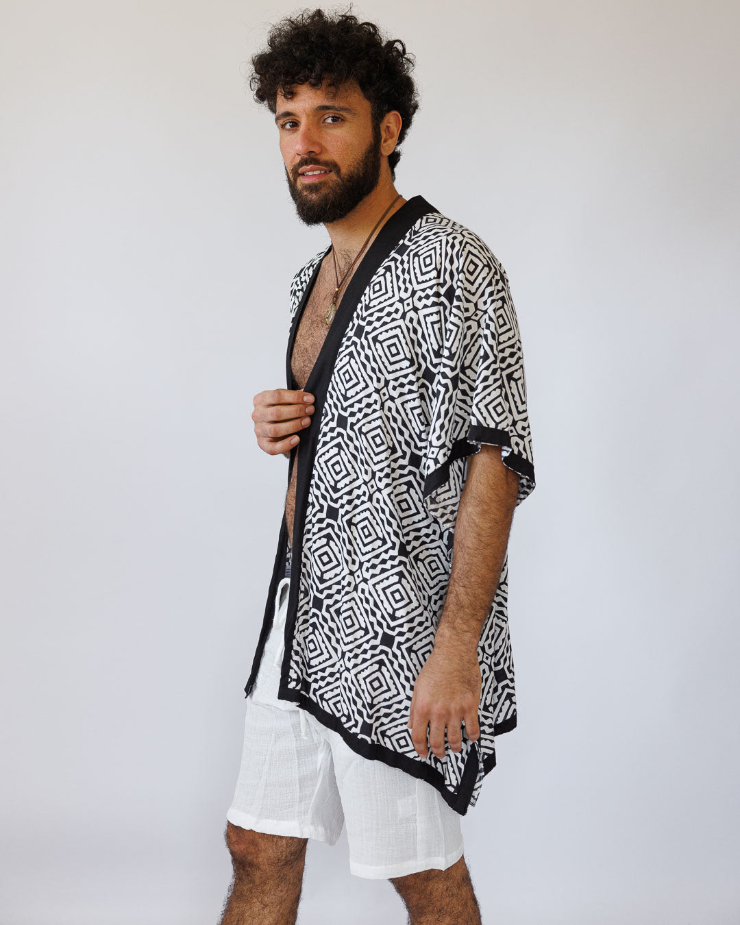 קימונו ויסקוז קצר, שרוול ארוך בהדפס מעונים שחור לבן לגבר