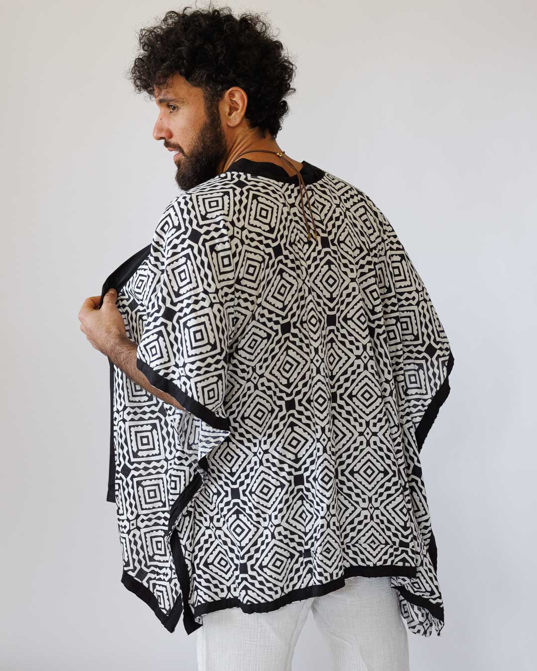קימונו קצר שחור־לבן בהדפס שבטי: שכבה קלילה עם וייב בוהו נקי — הדפס גאומטרי שבטי בגווני שחור, לבן עם מסגרת שחורה שנותנת מסגור חד ומדויק. גזרת עטלף רחבה שנופלת רך על הגוף, עם שסעים בצדדים לתנועה חופשית.