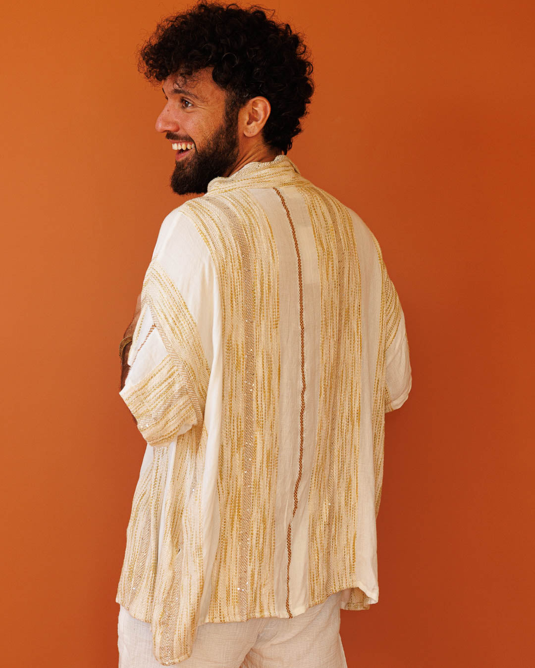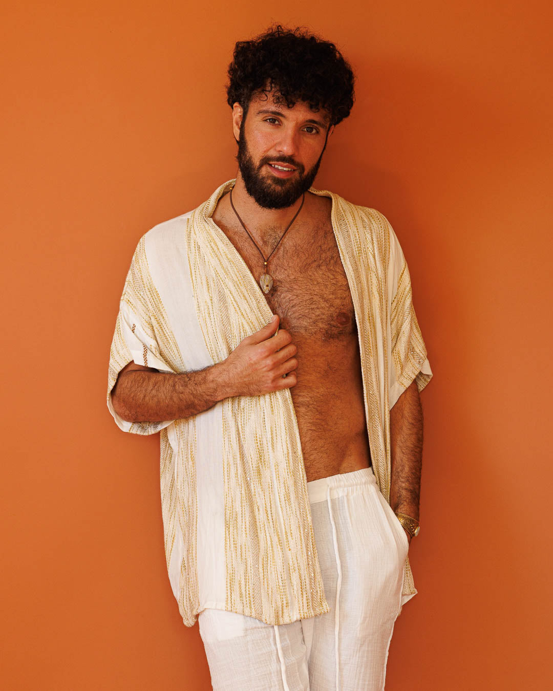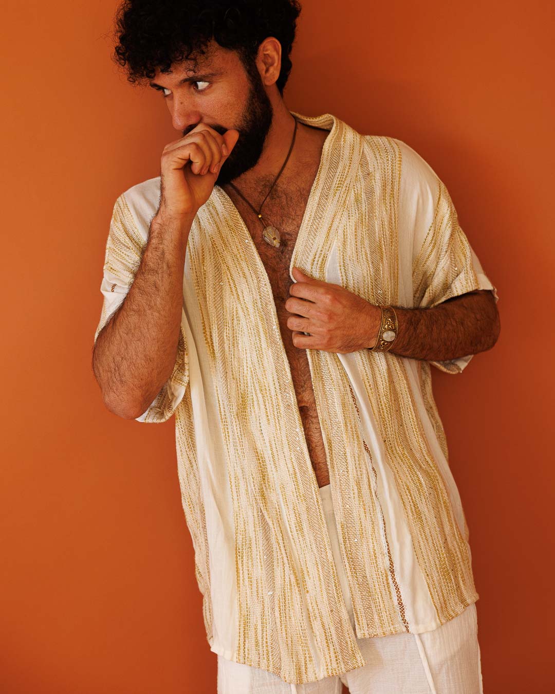 קימונו לבן באריגה מדברית: שכבה ארוכה בגזרה חופשית עם נוכחות רגועה. הבד עשוי 100% ויסקוז באריגת “מדברית” ייחודית – טקסטורה עדינה שמזכירה אריגת יד מסורתית, עם נגיעות קטנות של פייטים שמנצנצות באור ומוסיפות עניין. שילוב של לבן עם דוגמה שבטית בגווני חמרה/חול נותן עומק וחום, ונופל יפה על הגוף. נלבש פתוח ללוק זורם או קשור עם החגורה כשבא לך מראה יותר אסוף.