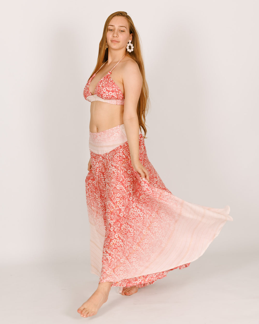 מכנס משי ארוך חצי רשת תכלת פרחוני אדום
