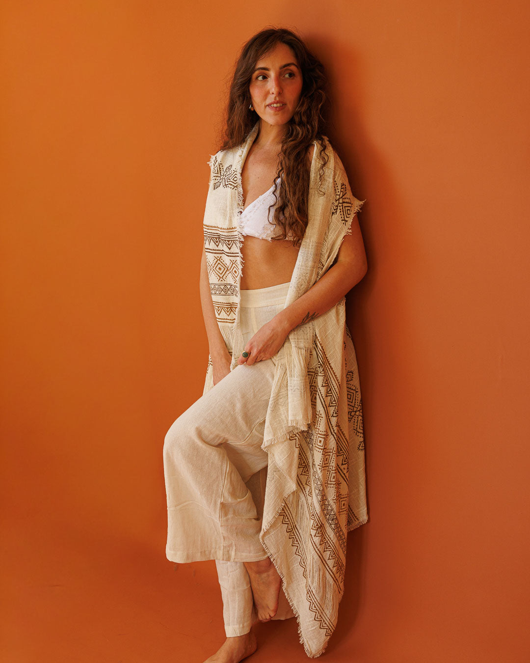 פונצו אתני יוניסקס פתוח: שכבה קלה עם נוכחות – פונצו פתוח שנופל יפה על הגוף, עשוי 100% כותנה עם הדפס חותמות עץ ידני שמייצר עומק וטקסטורה טבעית.