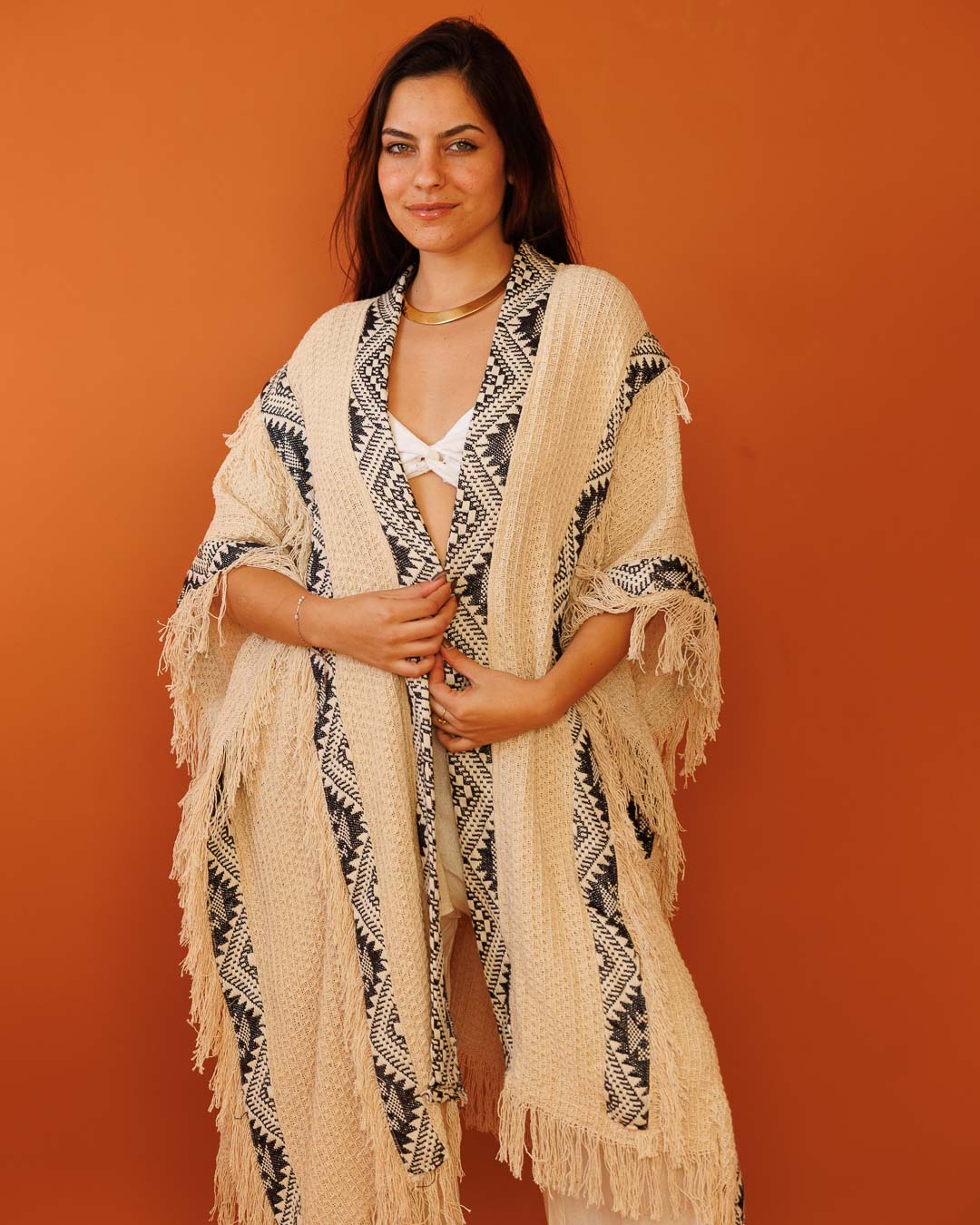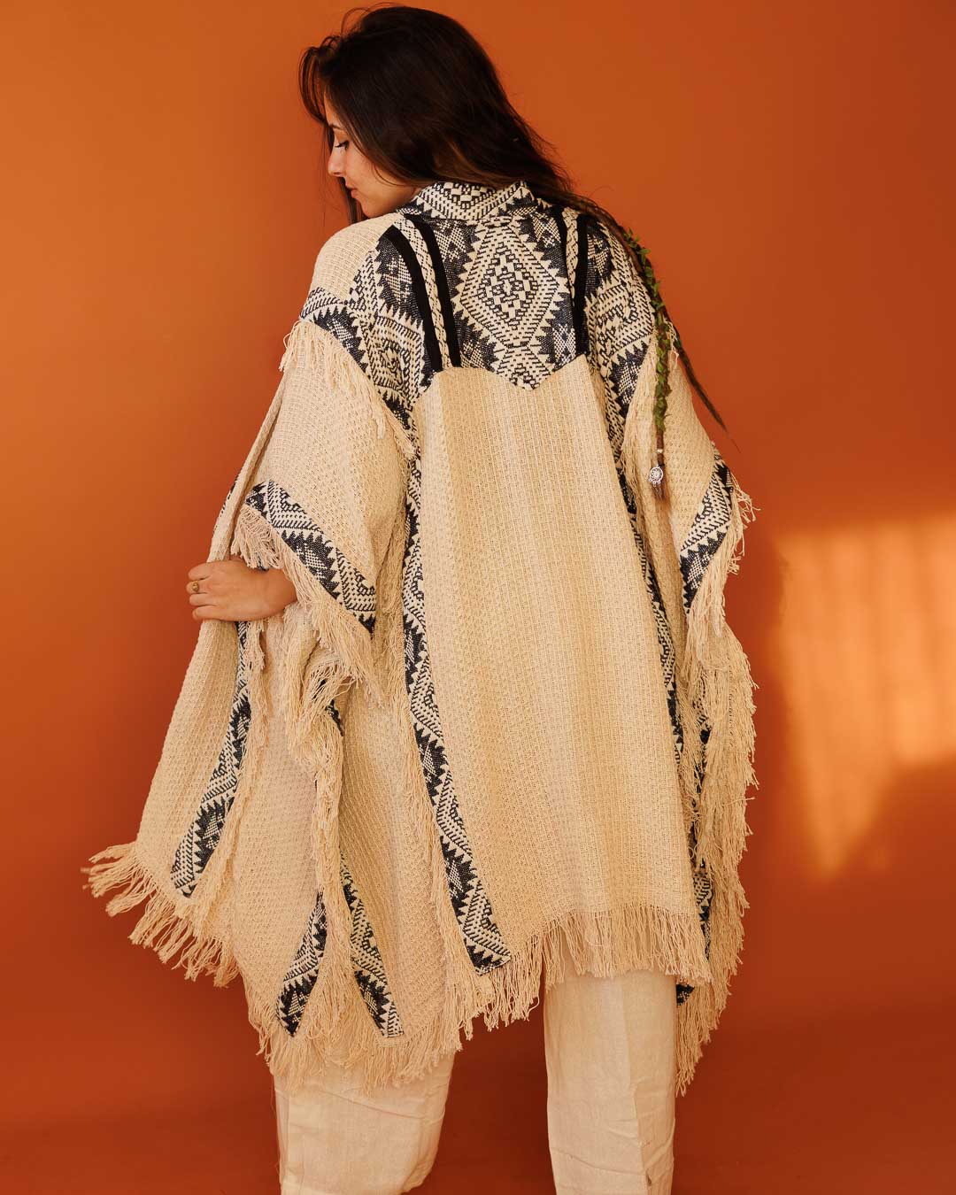 ז׳קט שכבה בגזרה רופפת שנועד לכסות את הגוף בצורה נינוחה ולא מתאמצת. ההשראה מגיעה מהחיבור בין הקימונו היפני לפונצ׳ו השבטי — פריט אחד שמרגיש קל לזרוק על הגוף, אבל מוסיף אופי ישר.